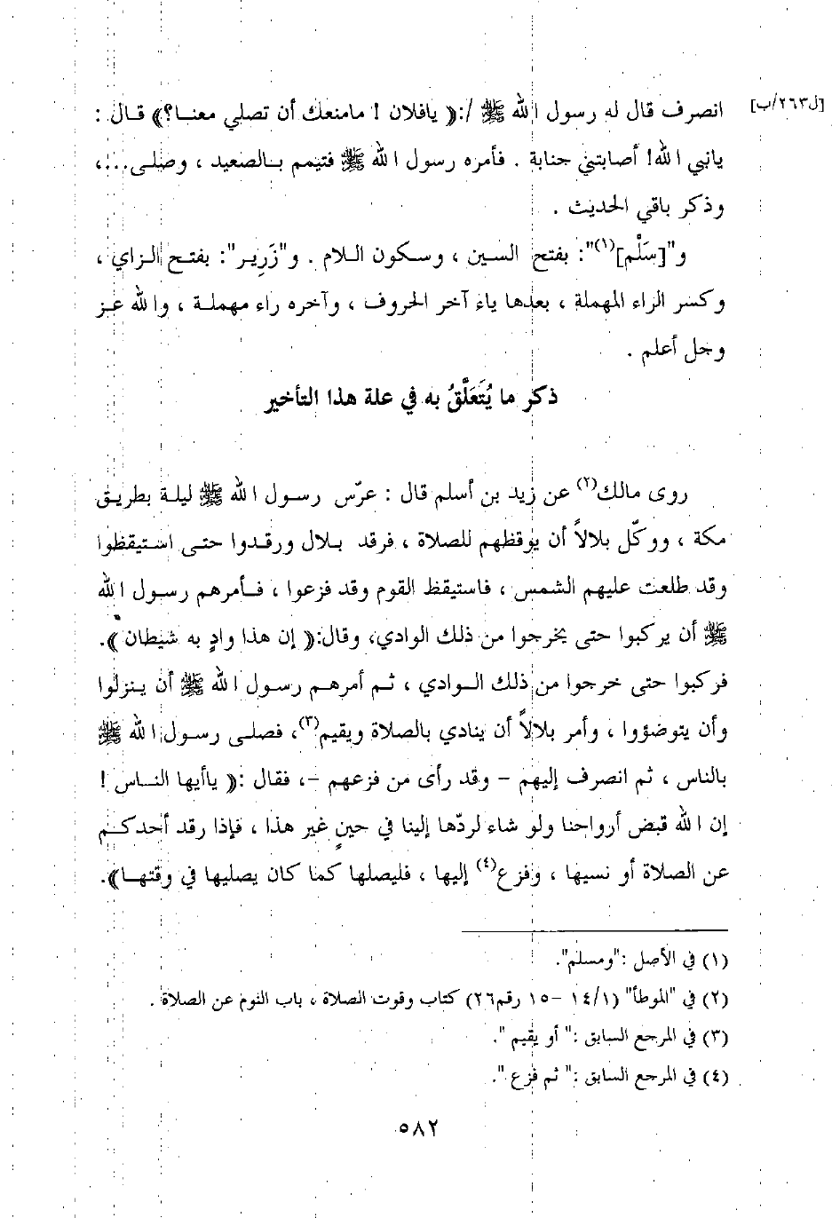 روى مالك عن زيد بن أسلم قال: عرس رسول الله صلى الله عليه وسلم ليلة بطريق مكة، ووكل بلالا أن يوقظهم للصلاة، فرقد بلال ورقدوا حتى استيقظوا وقد طلعت عليهم الشمس، فاستيقظ القوم وقد فزعوا، فأمرهم رسول الله صلى الله عليه وسلم أن يركبوا حتى يخرجوا من ذلك الوادي، فقال: إن هذا واد به شيطان، فركبوا حتى خرجوا من ذلك الوادي، ثم أمرهم رسول الله صلى الله عليه وسلم أن ينزلوا وأن يتوضؤوا، وأمر بلالا أن ينادي بالصلاة ويقيم، فصلى رسول الله صلى الله عليه وسلم بالناس، ثم انصرف إليهم – وقد رأى من فزعهم –، فقال: "يا أيها الناس! إن الله قبض أرواحنا ولو شاء لردها إلينا في حين غير هذا، فإذا رقد أحدكم عن الصلاة أو نسيها، وفزع إليها، فليصلها كما كان يصليها في وقتها ".