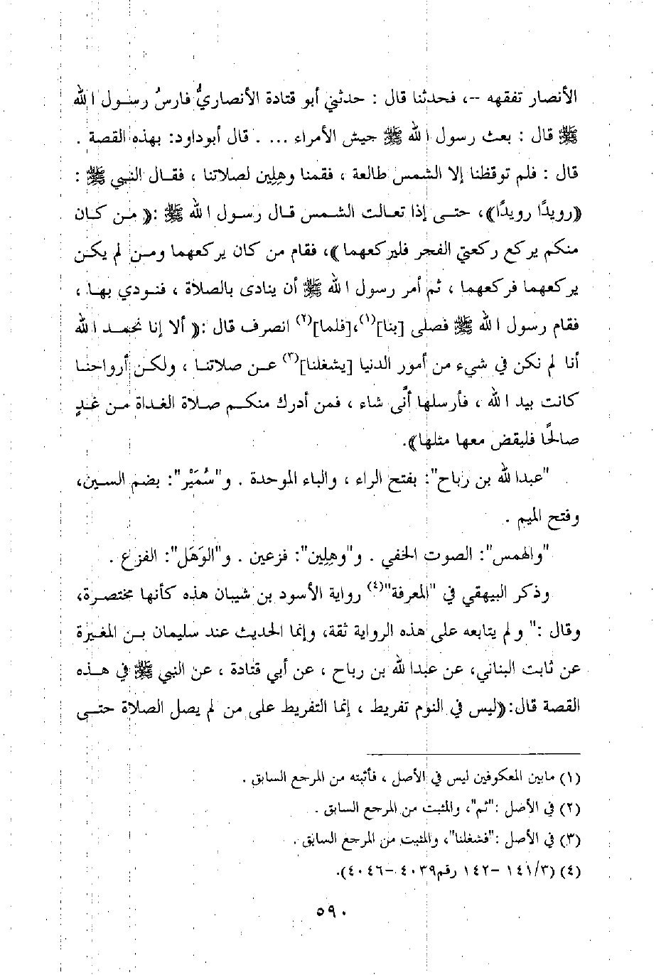 وذكر البيهقي في "المعرفة" رواية الأسود بن شيبان هذه كأنها مختصرة، وقال: "ولم يتابعه على هذه الرواية ثقة، وإنما الحديث عند سليمان بن المغيرة عن ثابت البناني، عن عبد الله بن رباح، عن أبي قتادة، عن النبي صلى الله عليه وسلم في هذه القصة قال: "ليس في النوم تفريط، إنما التفريط على من لم يصل الصلاة حتى