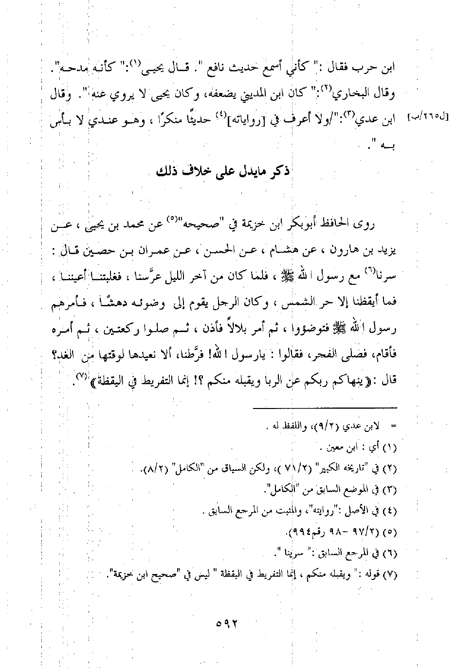 روى الحافظ أبو بكر ابن خزيمة في "صحيحه" عن محمد بن يحيى، عن يزيد بن هارون، عن هشام، عن الحسن، عن عمران بن حصين قال: سرنا مع رسول الله صلى الله عليه وسلم، فلما كان من آخر الليل عرسنا، فغلبتنا أعيننا، فما أيقظنا إلا حر الشمس، وكان الرجل يقوم إلى وضوئه دهشا، فأمرهم رسول الله صلى الله عليه وسلم فتوضؤوا، ثم أمر بلالا فأذن، ثم صلوا ركعتين، ثم أمره فأقام، فصلى الفجر، فقالوا: يا رسول الله! فرطنا، ألا نعيدها لوقتها من الغد؟ قال: "ينهاكم ربكم عن الربا ويقبله منكم؟! إنما التفريط في اليقظة".