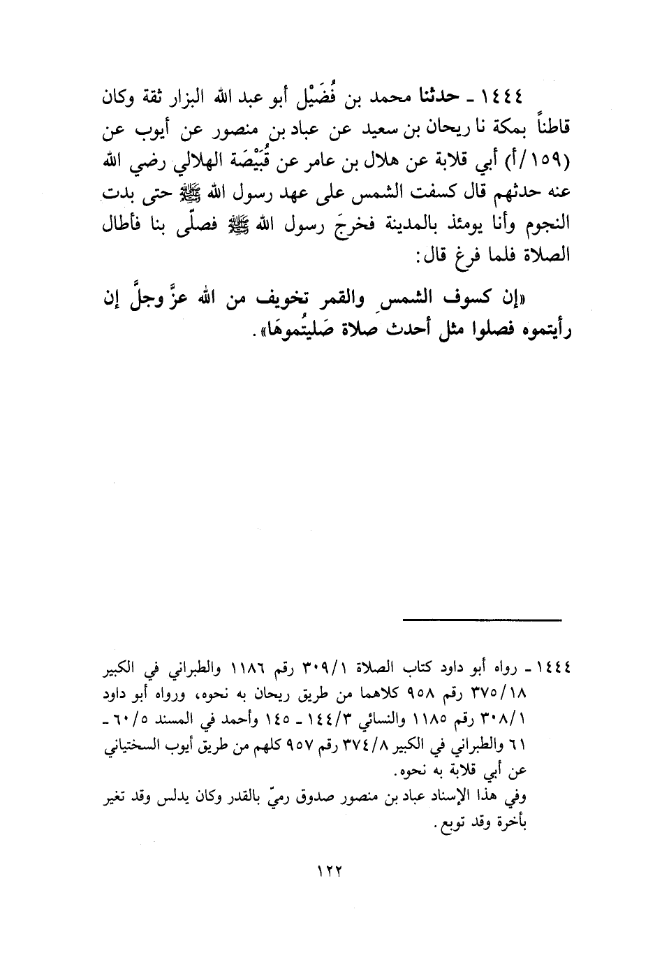 1444 - حَدَّثَنَا مُحَمَّدُ بْنُ فُضَيْلٍ أَبُو عَبْدِ اللَّهِ الْبَزَّارُ ثِقَةٌ، وَكَانَ قَاطِنًا بِمَكَّةَ، نا رَيْحَانُ بْنُ سَعِيدٍ، عَنْ عَبَّادِ بْنِ مَنْصُورٍ، عَنْ أَيُّوبَ، عَنْ أَبِي قِلَابَةَ، عَنْ هِلَالِ بْنِ عَامِرٍ، عَنِ قُبَيْصَة الْهِلَالِيِّ رَضِيَ اللَّهُ عَنْهُ حَدَّثَهُمْ قَالَ: كَسَفَتِ الشَّمْسُ عَلَى عَهْدِ رَسُولِ اللَّهِ صَلَّى اللهُ عَلَيْهِ وَسَلَّمَ حَتَّى بَدَتِ النُّجُومُ وَأَنَا يَوْمَئِذٍ بِالْمَدِينَةِ، فَخَرَجَ رَسُولُ اللَّهِ صَلَّى اللهُ عَلَيْهِ وَسَلَّمَ، فَصَلَّى بِنَا فَأَطَالَ الصَّلَاةَ فَلَمَّا فَرَغَ قَالَ: «§إِنَّ كُسُوفَ الشَّمْسِ وَالْقَمَرِ تَخْوِيفٌ مِنَ اللَّهِ عَزَّ وَجَلَّ إِنْ رَأَيْتُمُوهُ فَصَلُّوا مِثْلَ أَحْدَثِ صَلَاةٍ صَلَّيْتُمُوهَا»