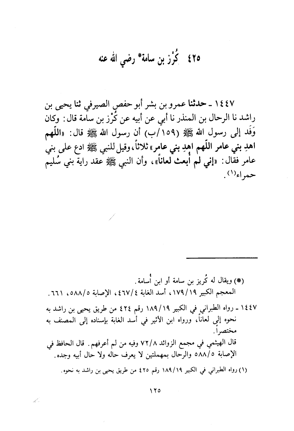 1447 - حَدَّثَنَا عَمْرُو بْنُ بِشْرٍ أَبُو حَفْصٍ الصَّيْرَفِيُّ، ثنا يَحْيَى بْنُ رَاشِدٍ، نا الرِّحَالُ بْنُ الْمُنْذِرِ، نا أَبِي، عَنْ أَبِيهِ، عَنْ كُرْزِ بْنِ سَامَةَ قَالَ: وَكَانَ وَفَدَ إِلَى رَسُولِ اللَّهِ صَلَّى اللهُ عَلَيْهِ وَسَلَّمَ، أَنَّ رَسُولَ اللَّهِ صَلَّى اللهُ عَلَيْهِ وَسَلَّمَ قَالَ: «§اللَّهُمَّ اهْدِ بَنِي عَامِرٍ. اللَّهُمَّ اهْدِ بَنِي عَامِرٍ ثَلَاثًا» . وَقِيلَ لِلنَّبِيِّ صَلَّى اللهُ عَلَيْهِ وَسَلَّمَ: ادْعُ عَلَى بَنِي عَامِرٍ فَقَالَ: «إِنِّي لَمْ أُبْعَثْ لَعَّانًا» وَإِنَّ النَّبِيَّ صَلَّى اللهُ عَلَيْهِ وَسَلَّمَ «عَقَدَ رَايَةَ بَنِي سُلَيْمٍ حَمْرَاءَ»