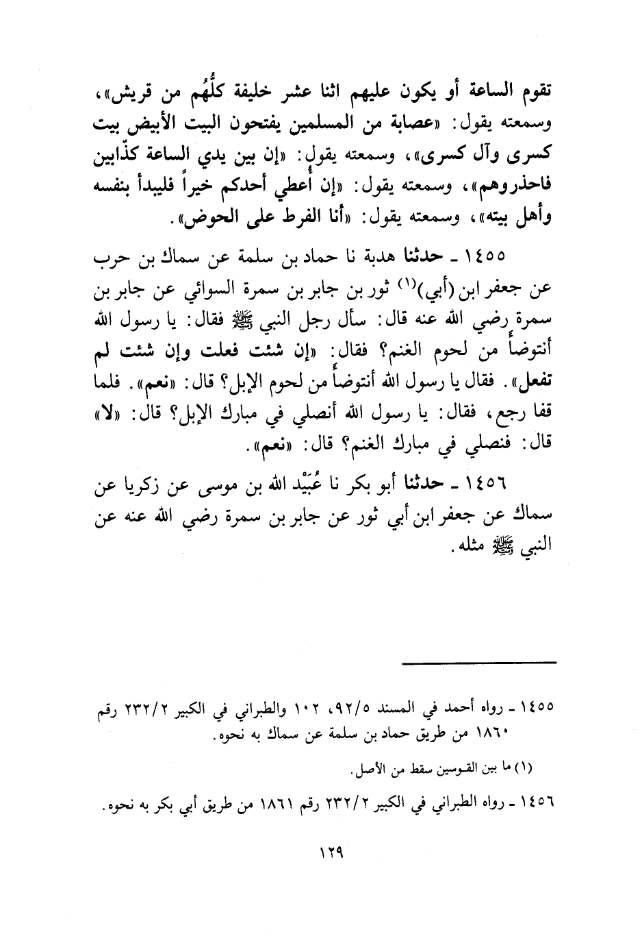 1455 - حَدَّثَنَا هُدْبَةُ، نا حَمَّادُ بْنُ سَلَمَةَ، عَنْ سِمَاكِ بْنِ حَرْبٍ، عَنْ جَعْفَرِ بْنِ أَبِي ثَوْرِ بْنِ جَابِرِ بْنِ سَمُرَةَ السُّوَائِيُّ، عَنْ جَابِرِ بْنِ سَمُرَةَ رَضِيَ اللَّهُ عَنْهُ قَالَ: سَأَلَ رَجُلٌ النَّبِيَّ صَلَّى اللهُ عَلَيْهِ وَسَلَّمَ فَقَالَ: " §يَا رَسُولَ اللَّهِ أَنَتَوَضَّأُ مِنْ لُحُومِ الْغَنَمِ؟ فَقَالَ: إِنْ شِئْتَ فَعَلْتَ وَإِنْ شِئْتَ لَمْ تَفْعَلْ ". فَقَالَ: يَا رَسُولَ اللَّهِ أَنَتَوَضَّأُ مِنْ لُحُومِ الْإِبِلِ؟ قَالَ: «نَعَمْ» . فَلَمَّا قَفَاَ رَجَعَ فَقَالَ: " يَا رَسُولَ اللَّهِ أَنُصَلِّي فِي مَبَارِكِ الْإِبِلِ؟ قَالَ: «لَا» . قَالَ: فَنُصَلِّي فِي مَبَارِكِ الْغَنَمِ؟ قَالَ: «نَعَمْ»