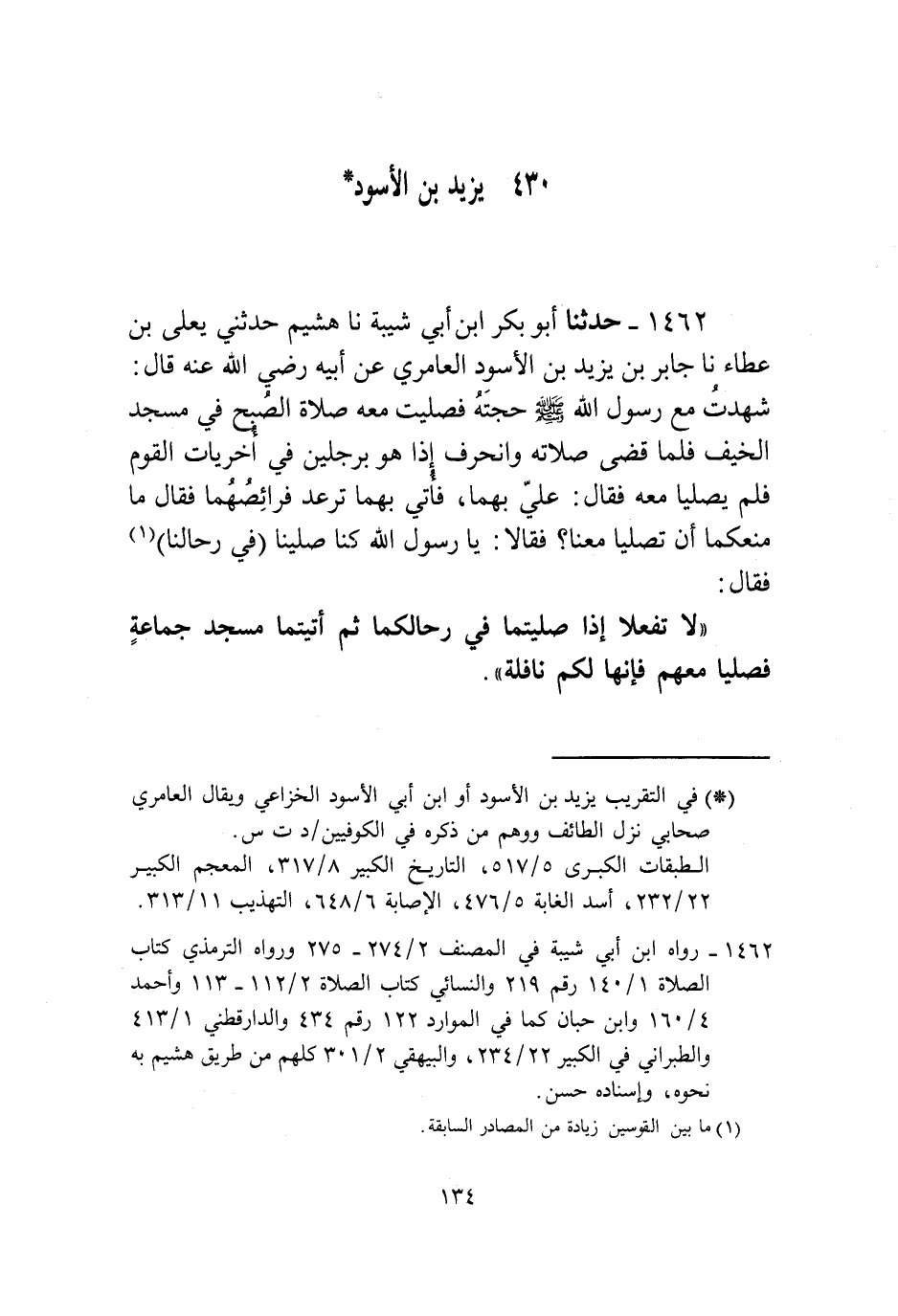1462 - حَدَّثَنَا أَبُو بَكْرِ بْنُ أَبِي شَيْبَةَ، نا هُشَيْمٌ، حَدَّثَنِي يَعْلَى بْنُ عَطَاءٍ، نا جَابِرُ بْنُ يَزِيدَ بْنِ الْأَسْوَدِ الْعَامِرِيُّ، عَنْ أَبِيهِ رَضِيَ اللَّهُ عَنْهُ قَالَ: شَهِدْتُ مَعَ رَسُولِ اللَّهِ صَلَّى اللهُ عَلَيْهِ وَسَلَّمَ حَجَّتَهُ فَصَلَّيْتُ مَعَهُ صَلَاةَ الصُّبْحِ فِي مَسْجِدِ الْخَيْفِ فَلَمَّا قَضَى صَلَاتَهُ وَانْحَرَفَ إِذَا هُوَ بِرَجُلَيْنِ فِي أُخْرَيَاتِ الْقَوْمِ فَلَمْ يُصَلِّيَا مَعَهُ فَقَالَ: «عَلَيَّ بِهِمَا» . فَأُتِيَ بِهِمَا تُرْعَدُ فَرَائِصُهُمَا فَقَالَ: «مَا مَنَعَكُمَا أَنْ تُصَلِّيَا مَعَنَا؟» فَقَالَا: يَا رَسُولَ اللَّهِ كُنَّا صَلَّيْنَا فِي رِحَالَنَا. فَقَالَ: «§لَا تَفْعَلَا إِذَا صَلَّيْتُمَا فِي رِحَالِكُمَا، ثُمَّ أَتَيْتُمَا مَسْجِدَ جَمَاعَةٍ فَصَلِّيَا مَعَهُمْ؛ فَإِنَّهَا لَكُمْ نَافِلَةٌ»