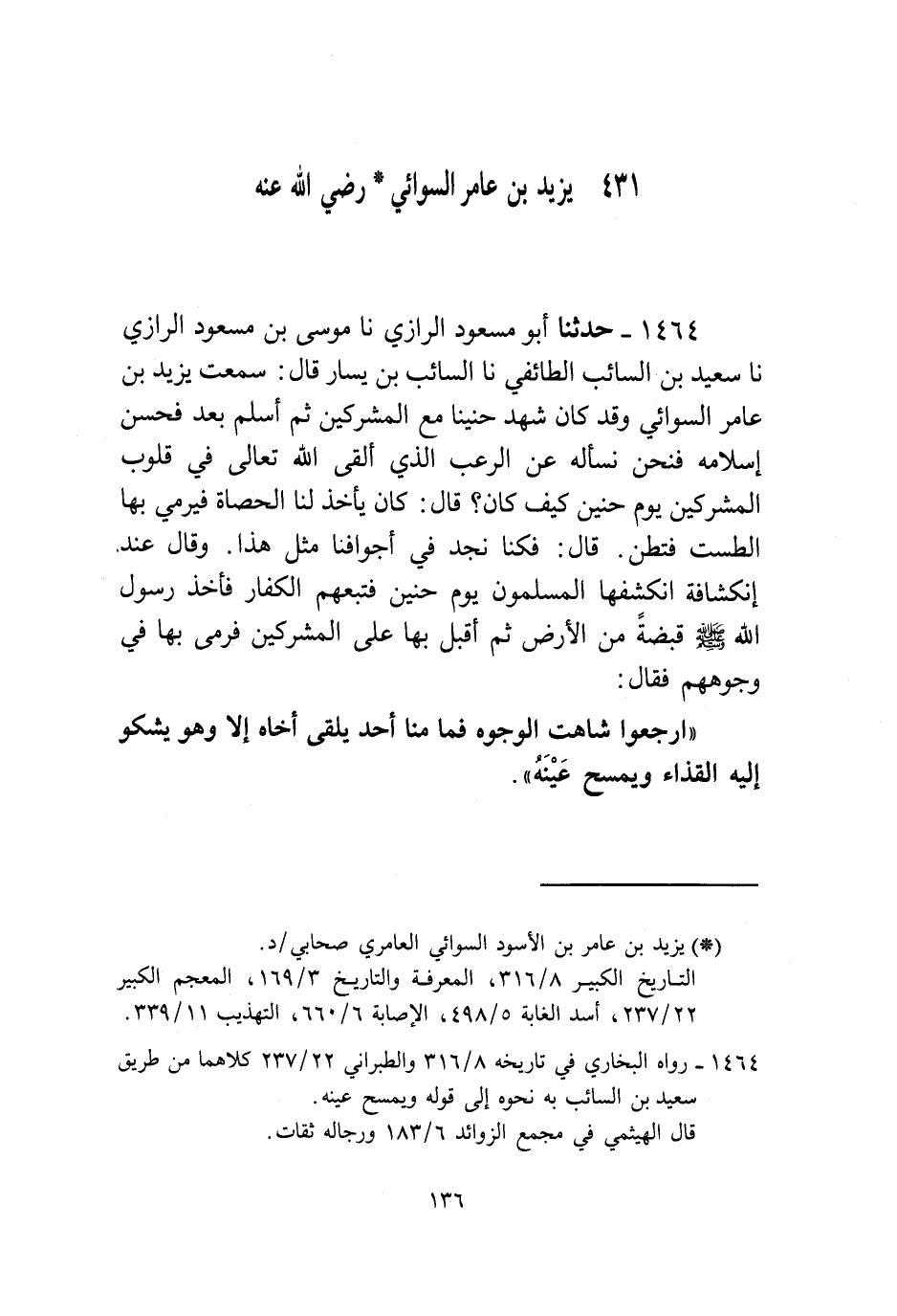 1464 - حَدَّثَنَا أَبُو مَسْعُودٍ الرَّازِيُّ، نا مُوسَى بْنُ مَسْعُودٍ الرَّازِيُّ، نا سَعِيدُ بْنُ السَّائِبِ الطَّائِفِيُّ، نا السَّائِبُ بْنُ يَسَارٍ قَالَ: سَمِعْتُ يَزِيدَ بْنَ عَامِرٍ السُّوَائِيَّ وَقَدْ كَانَ شَهِدَ حُنَيْنًا مَعَ الْمُشْرِكِينَ، ثُمَّ أَسْلَمَ بَعْدُ فَحَسُنَ إِسْلَامُهُ، فَنَحْنُ نَسْأَلْهُ عَنِ " §الرُّعْبِ الَّذِي أَلْقَى اللَّهُ تَعَالَى فِي قُلُوبِ الْمُشْرِكِينَ يَوْمَ حُنَيْنٍ كَيْفَ كَانَ؟ قَالَ: كَانَ يَأْخُذُ لَنَا الْحَصَاةَ فَيَرْمِي بِهَا الطَّسْتَ فَتَطِنُّ قَالَ: فَكُنَّا نَجِدُ فِي أَجْوَافِنَا مِثْلَ هَذَا. وَقَالَ عِنْدَ انْكِشَافَةٍ انْكَشَفَهَا الْمُسْلِمُونَ يَوْمَ حُنَيْنٍ فَتَبِعَهُمُ الْكُفَّارُ فَأَخَذَ رَسُولُ اللَّهِ صَلَّى اللهُ عَلَيْهِ وَسَلَّمَ قَبْضَةً مِنَ الْأَرْضِ، ثُمَّ أَقْبَلَ بِهَا عَلَى الْمُشْرِكِينَ فَرَمَى بِهَا فِي وُجُوهُهُمْ فَقَالَ: «ارْجِعُوا شَاهَتِ الْوُجُوهُ» فَمَا مِنَّا أَحَدٌ يَلْقَى أَخَاهُ إِلَّا وَهُوَ يَشْكُو إِلَيْهِ الْقَذَاءَ وَيَمْسَحُ عَيْنَهُ