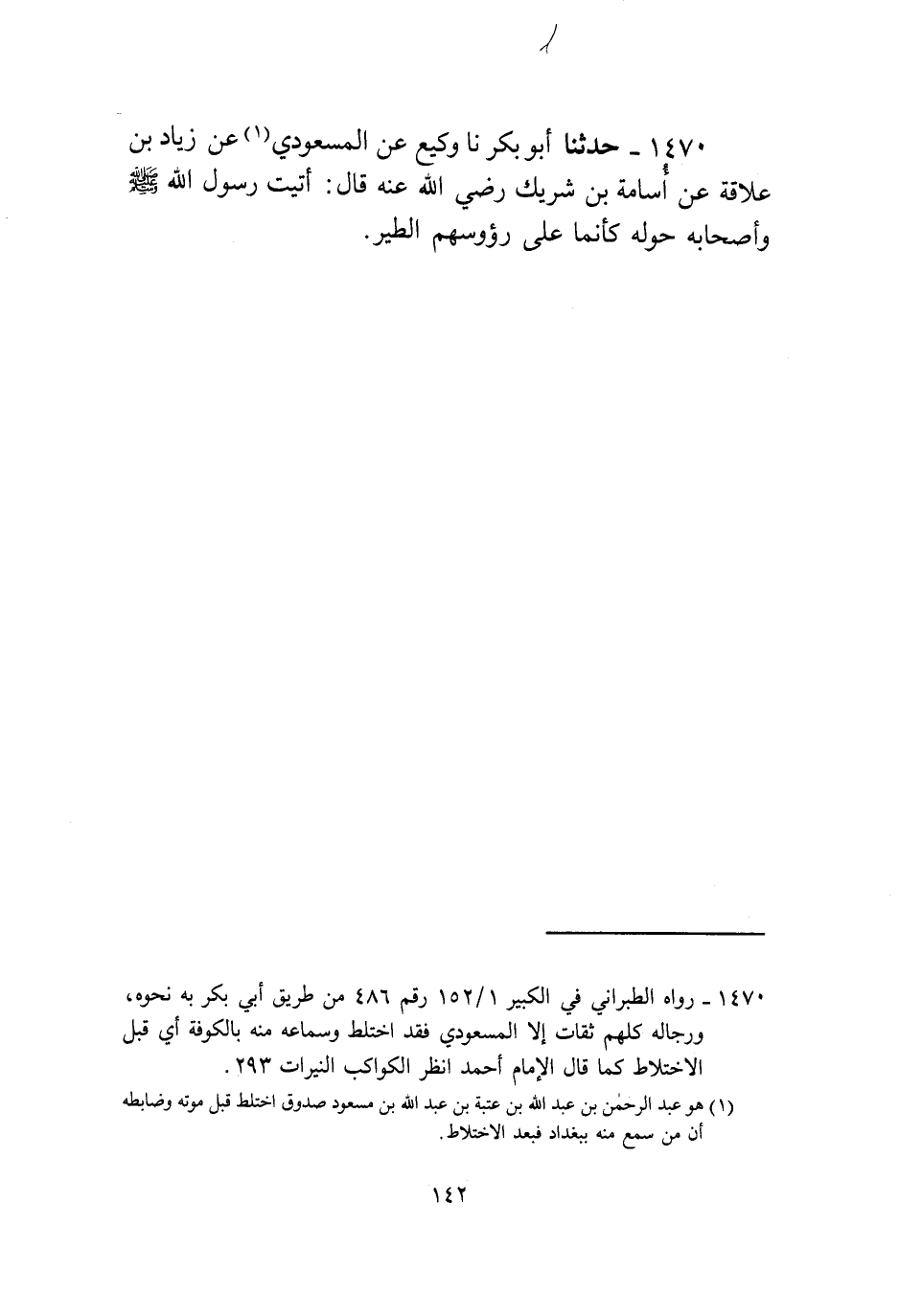 1470 - حَدَّثَنَا أَبُو بَكْرٍ، نا وَكِيعٌ، عَنِ الْمَسْعُودِيِّ، عَنْ زِيَادِ بْنِ عِلَاقَةَ، عَنْ أُسَامَةَ بْنِ شَرِيكٍ رَضِيَ اللَّهُ عَنْهُ قَالَ: «§أَتَيْتُ رَسُولَ اللَّهِ صَلَّى اللهُ عَلَيْهِ وَسَلَّمَ وَأَصْحَابُهُ حَوْلَهُ كَأَنَّمَا عَلَى رُءُوسِهُمُ الطَّيْرُ»