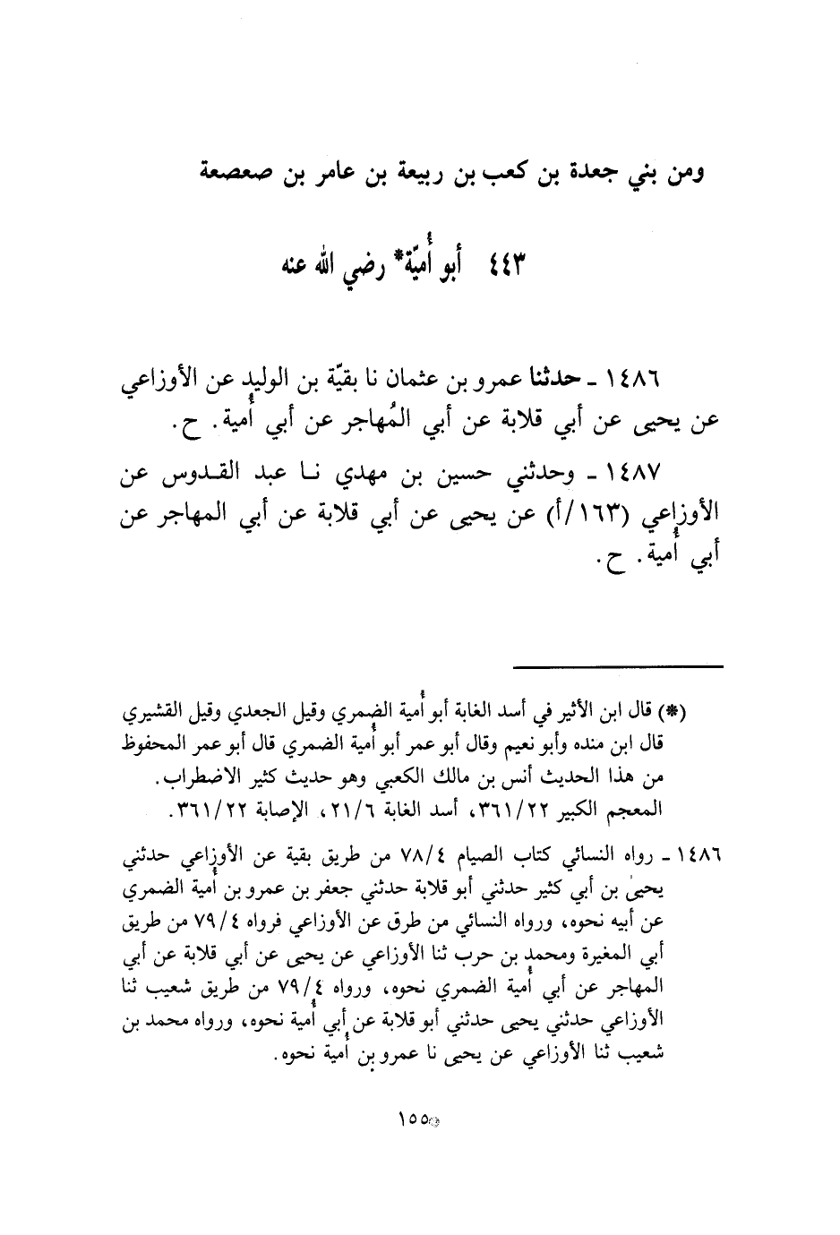 1488 -[156]- وَحَدَّثَنَا عَمْرُو بْنُ عُثْمَانَ، نا الْوَلِيدُ، عَنِ الْأَوْزَاعِيِّ، عَنْ يَحْيَى، عَنْ أَبِي قِلَابَةَ، حَدَّثَنِي أَبُو أُمَيَّةَ، أَوْ رَجُلٌ، عَنْ أَبِي أُمَيَّةَ، رَضِيَ اللَّهُ عَنْهُ قَالَ: قَدِمْتُ عَلَى رَسُولِ اللَّهِ صَلَّى اللهُ عَلَيْهِ وَسَلَّمَ مِنْ سَفَرٍ فَقَالَ: «أَلَا تَنْتَظِرِ الْغَدَاءَ يَا أَبَا أُمَيَّةَ؟» فَقُلْتُ: إِنِّي صَائِمٌ يَا رَسُولَ اللَّهِ. فَقَالَ: «§تَعَالَ أُخْبِرْكَ إِنَّ اللَّهَ تَعَالَى وَضَعَ عَنِ الْمُسَافِرِ الصِّيَامِ وَنِصْفَ الصَّلَاةِ»
