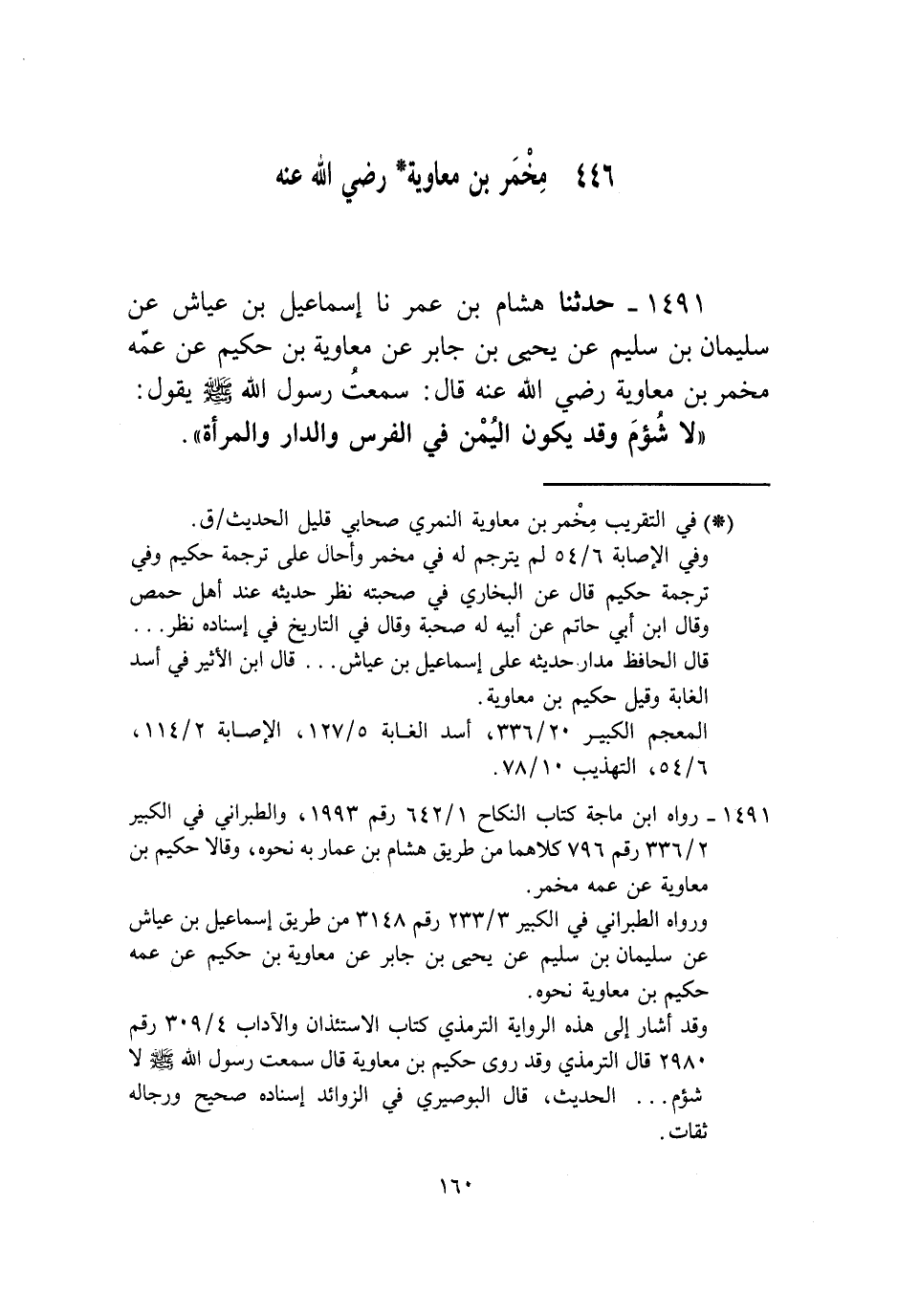 1491 - حَدَّثَنَا هِشَامُ بْنُ عَمارٍ، نا إِسْمَاعِيلُ بْنُ عَيَّاشٍ، عَنْ سُلَيْمَانَ بْنِ سُلَيْمٍ، عَنْ يَحْيَى بْنِ جَابِرٍ، عَنْ مُعَاوِيَةَ بْنِ حَكِيمٍ، عَنْ عَمِّهِ مِخْمَرِ بْنِ مُعَاوِيَةَ رَضِيَ اللَّهُ عَنْهُ قَالَ: سَمِعْتُ رَسُولَ اللَّهِ صَلَّى اللهُ عَلَيْهِ وَسَلَّمَ يَقُولُ: «§لَا شُؤْمَ، وَقَدْ يَكُونُ الْيُمْنُ فِي الْفَرَسِ وَالدَّارِ وَالْمَرْأَةِ»