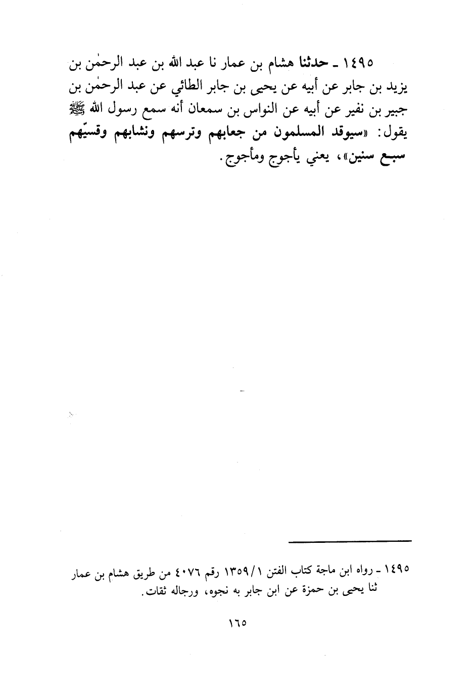 1495 - حَدَّثَنَا هِشَامُ بْنُ عَمَّارٍ، نا عَبْدُ اللَّهِ بْنُ عَبْدِ الرَّحْمَنِ بْنِ يَزِيدَ بْنِ جَابِرٍ، عَنْ أَبِيهِ، عَنْ يَحْيَى بْنِ جَابِرٍ الطَّائِيِّ، عَنْ عَبْدِ الرَّحْمَنِ بْنِ جُبَيْرِ بْنِ نُفَيْرٍ، عَنْ أَبِيهِ، عَنِ النَّوَّاسِ بْنِ سَمْعَانَ، أَنَّهُ سَمِعَ رَسُولَ اللَّهِ صَلَّى اللهُ عَلَيْهِ وَسَلَّمَ يَقُولُ: " §سَيُوقِدُ الْمُسْلِمُونَ مِنْ جِعَابِهِمْ وَتُرُسِهِمْ وَنُشَّابِهِمْ وَقِسِيِّهِمْ سَبْعَ سِنِينَ يَعْنِي: يَأْجُوجَ وَمَأْجُوجَ "