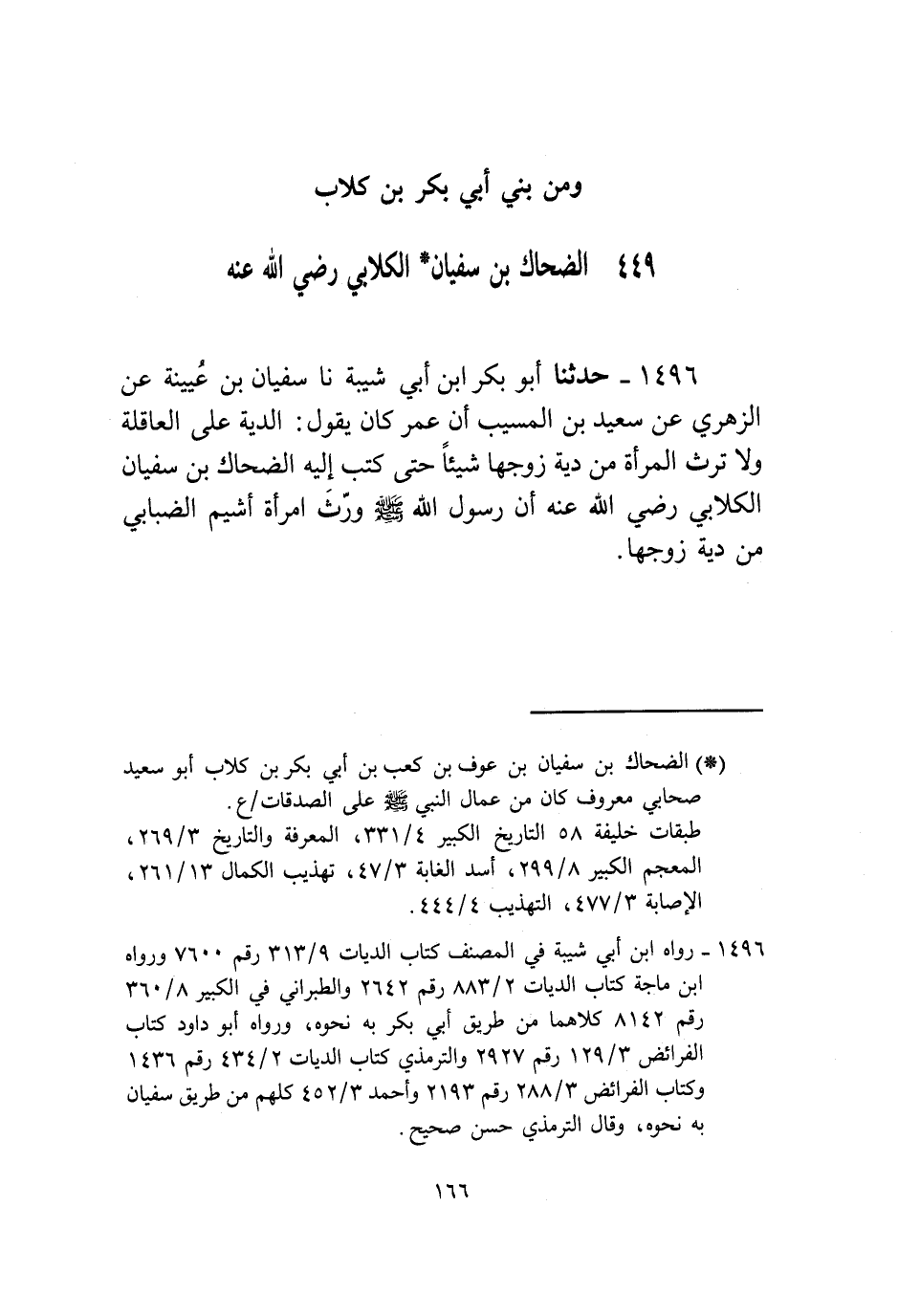1496 - حَدَّثَنَا أَبُو بَكْرِ بْنُ أَبِي شَيْبَةَ، نا سُفْيَانُ بْنُ عُيَيْنَةَ، عَنِ الزُّهْرِيِّ، عَنْ سَعِيدِ بْنِ الْمُسَيِّبِ، أَنَّ عُمَرَ كَانَ يَقُولُ: الدِّيَةُ عَلَى الْعَاقِلَةِ وَلَا تَرِثُ الْمَرْأَةُ مِنْ دِيَةِ زَوْجِهَا شَيْئًا. حَتَّى كَتَبَ إِلَيْهِ الضَّحَّاكُ بْنُ سُفْيَانَ الْكِلَابِيُّ رَضِيَ اللَّهُ عَنْهُ «§أَنَّ رَسُولَ اللَّهِ صَلَّى اللهُ عَلَيْهِ وَسَلَّمَ وَرِثَ امْرَأَةَ أَشْيَمَ الضِّبَابِيِّ مِنْ دِيَةِ زَوْجِهَا»
