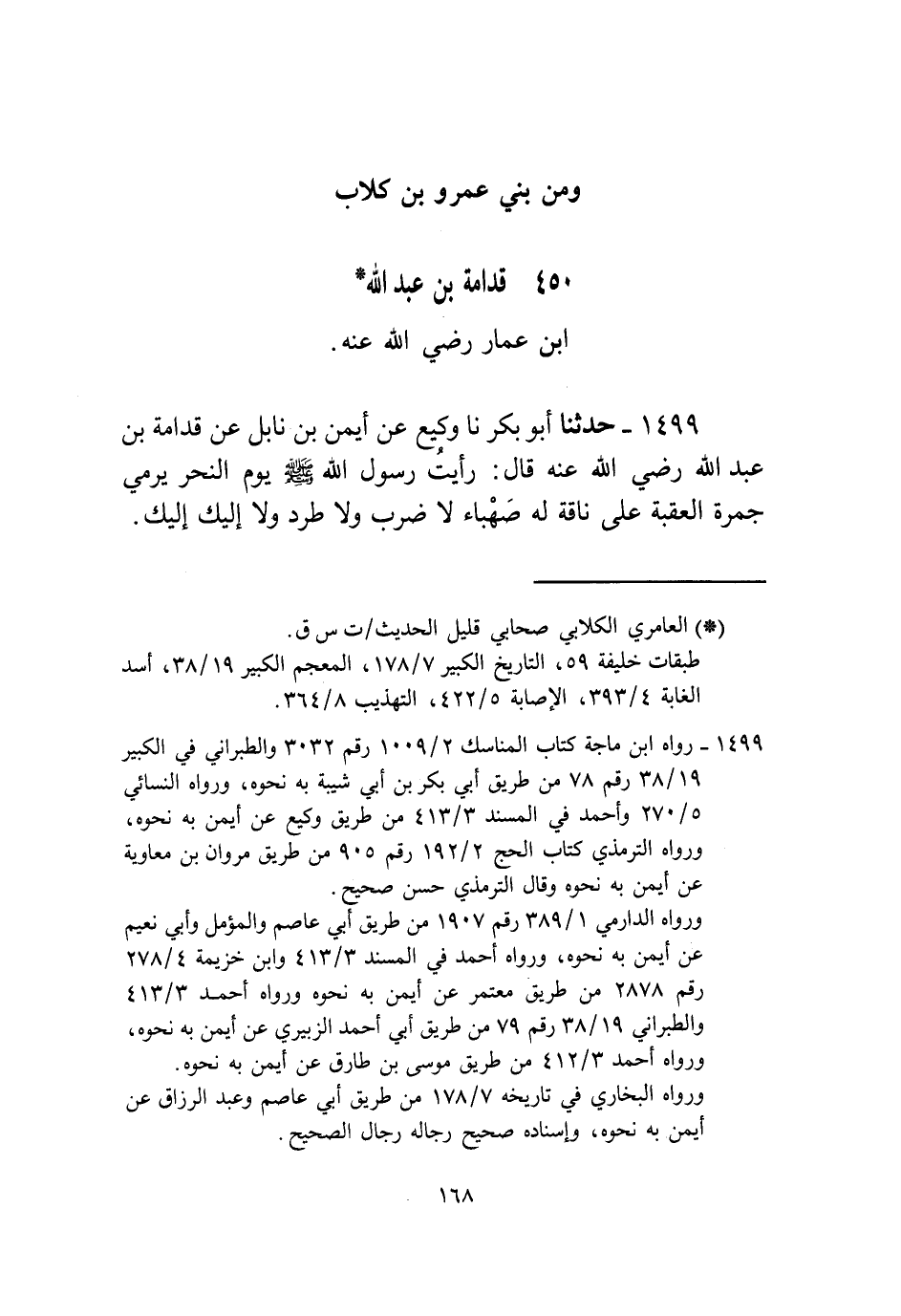 1499 - حَدَّثَنَا أَبُو بَكْرٍ، نا وَكِيعٌ، عَنْ أَيْمَنَ بْنِ نَابِلٍ، عَنْ قُدَامَةَ بْنِ عَبْدِ اللَّهِ، رَضِيَ اللَّهُ عَنْهُ قَالَ: §رَأَيْتُ 0 رَسُولَ اللَّهِ صَلَّى اللهُ عَلَيْهِ وَسَلَّمَ يَوْمَ النَّحْرِ يَرْمِي جَمْرَةَ الْعَقَبَةِ عَلَى نَاقَةٍ لَهُ صَهْبَاءَ لَا ضَرْبَ وَلَا طَرْدَ وَلَا إِلَيْكَ إِلَيْكَ