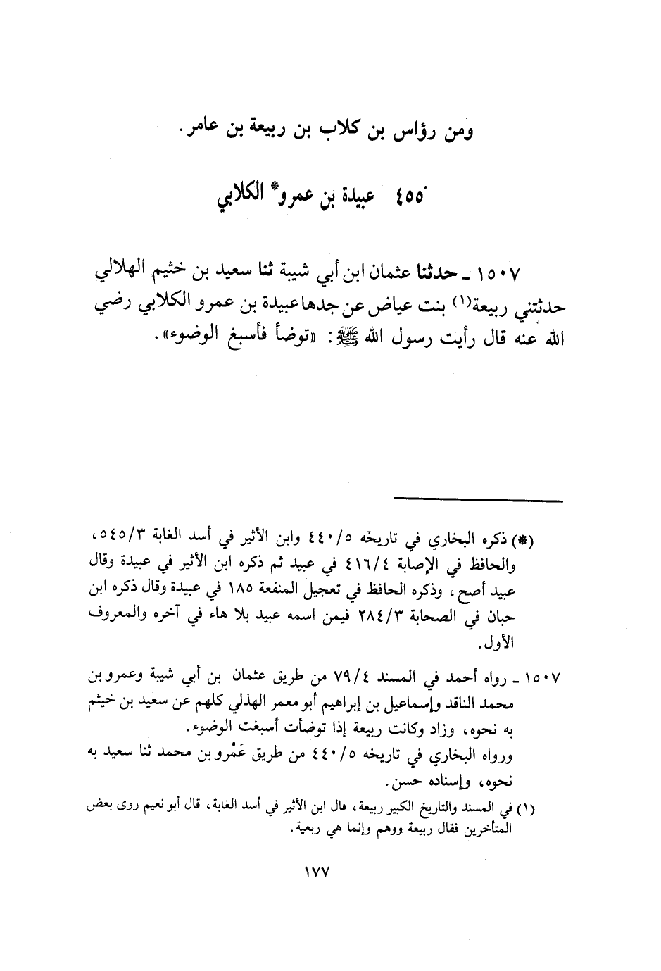 1507 - حَدَّثَنَا عُثْمَانُ بْنُ أَبِي شَيْبَةَ، ثنا سَعِيدُ بْنُ خُثَيْمٍ الْهِلَالِيُّ، حَدَّثَتْنِي رَبِيعَةُ بِنْتُ عِيَاضٍ، عَنْ جَدِّهَا عَبِيدَةَ بْنِ عَمْرٍو الْكِلَابِيِّ رَضِيَ اللَّهُ عَنْهُ قَالَ: رَأَيْتُ رَسُولَ اللَّهِ صَلَّى اللهُ عَلَيْهِ وَسَلَّمَ «§تَوَضَّأَ فَأَسْبَغَ الْوُضُوءَ»
