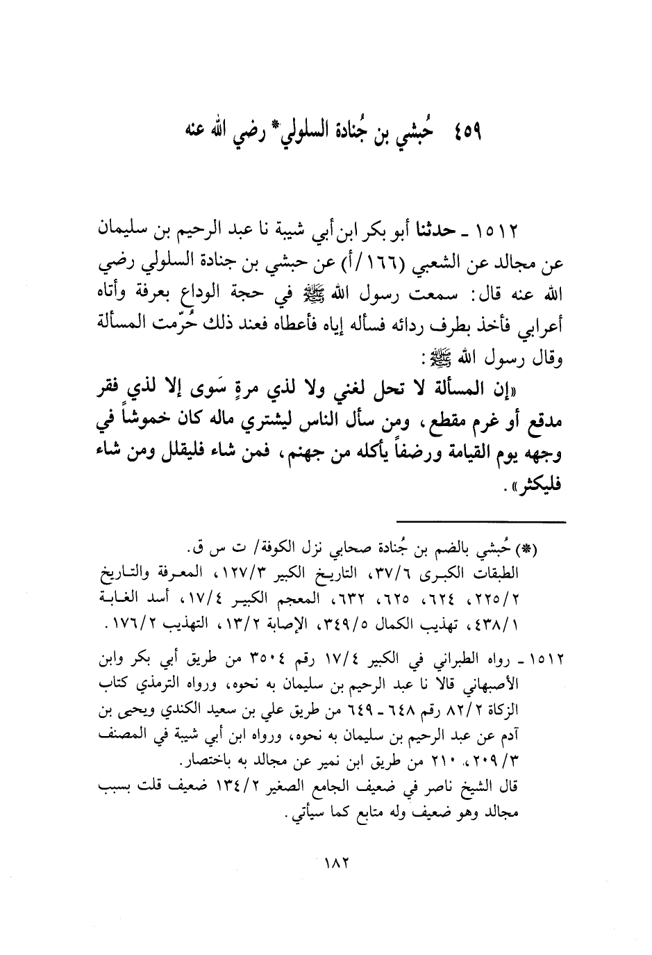 1512 - حَدَّثَنَا أَبُو بَكْرِ بْنُ أَبِي شَيْبَةَ، نا عَبْدُ الرَّحِيمِ بْنُ سُلَيْمَانَ، عَنْ مُجَالِدٍ، عَنِ الشَّعْبِيِّ، عَنْ حَبَشِيِّ بْنِ جُنَادَةَ السَّلُولِيِّ، رَضِيَ اللَّهُ عَنْهُ قَالَ: سَمِعْتُ رَسُولَ اللَّهِ صَلَّى اللهُ عَلَيْهِ وَسَلَّمَ فِي حَجَّةِ الْوَدَاعِ بِعَرَفَةَ وَأَتَاهُ أَعْرَابِيٌّ فَأَخَذَ بِطَرَفِ رِدَائِهِ فَسَأَلَهُ إِيَّاهُ فَأَعْطَاهُ فَعِنْدَ ذَلِكَ حُرِّمَتِ الْمَسْأَلَةُ. وَقَالَ رَسُولُ اللَّهِ صَلَّى اللهُ عَلَيْهِ وَسَلَّمَ: «§إِنَّ الْمَسْأَلَةَ لَا تَحِلُّ لَغَنِيٍّ وَلَا لِذِي مِرَّةٍ سَوِيٍّ إِلَّا لِذِي فَقْرٍ مُدْقِعٍ أَوْ غُرْمٍ مُفْظِعٍ، وَمَنْ سَأَلَ النَّاسَ لِيَشْتَرِيَ مَالَهُ كَانَ خُمُوشًا فِي وَجْهِهِ يَوْمَ الْقِيَامَةِ وَرَضْفًا يَأْكُلُهُ مِنْ جَهَنَّمَ، فَمَنْ شَاءَ فَلْيُقْلِلْ وَمَنْ شَاءَ فَلْيُكْثِرْ»