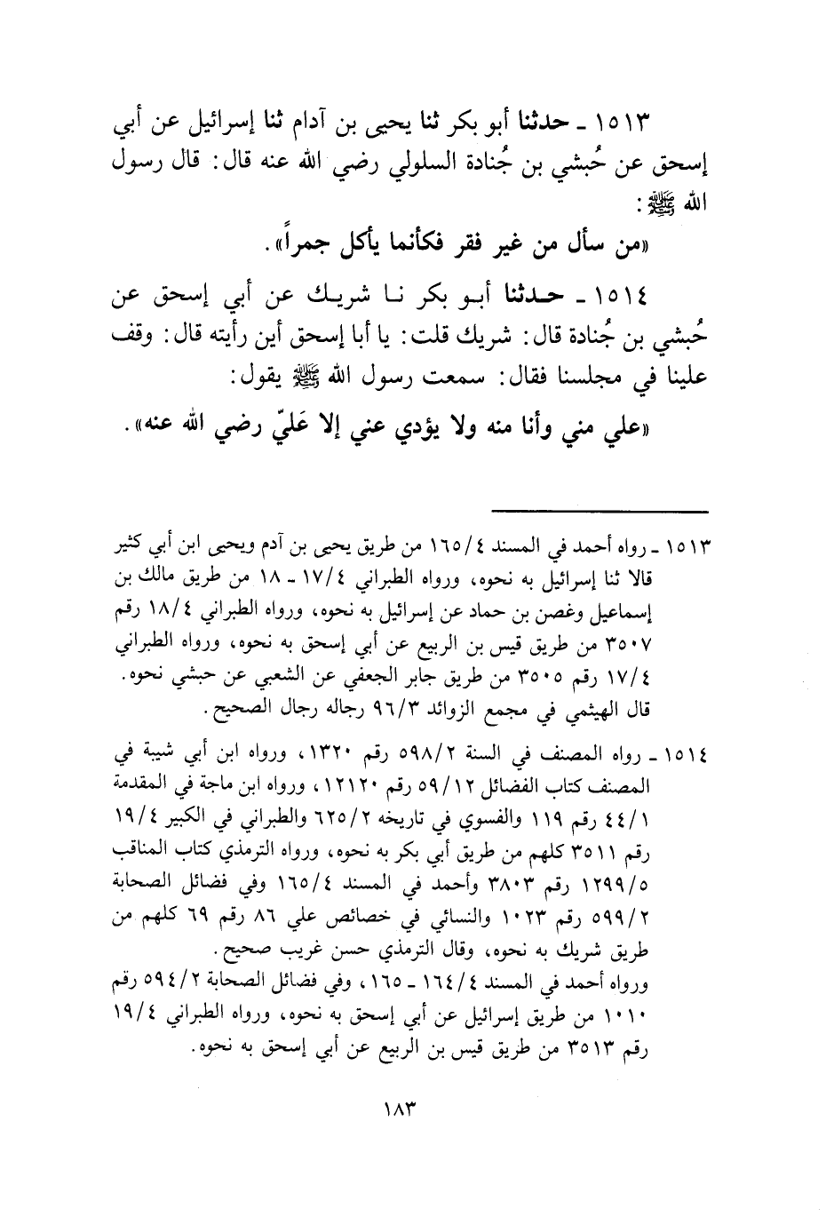 1513 - حَدَّثَنَا أَبُو بَكْرٍ، ثنا يَحْيَى بْنُ آدَمَ، ثنا إِسْرَائِيلُ، عَنْ أَبِي إِسْحَاقَ، عَنْ حَبَشِيِّ بْنِ جُنَادَةَ السَّلُولِيِّ، رَضِيَ اللَّهُ عَنْهُ قَالَ: قَالَ رَسُولُ اللَّهِ صَلَّى اللهُ عَلَيْهِ وَسَلَّمَ: «§مَنْ سَأَلَ مِنْ غَيْرِ فَقْرٍ فَكَأَنَّمَا يَأْكُلُ جَمْرًا»