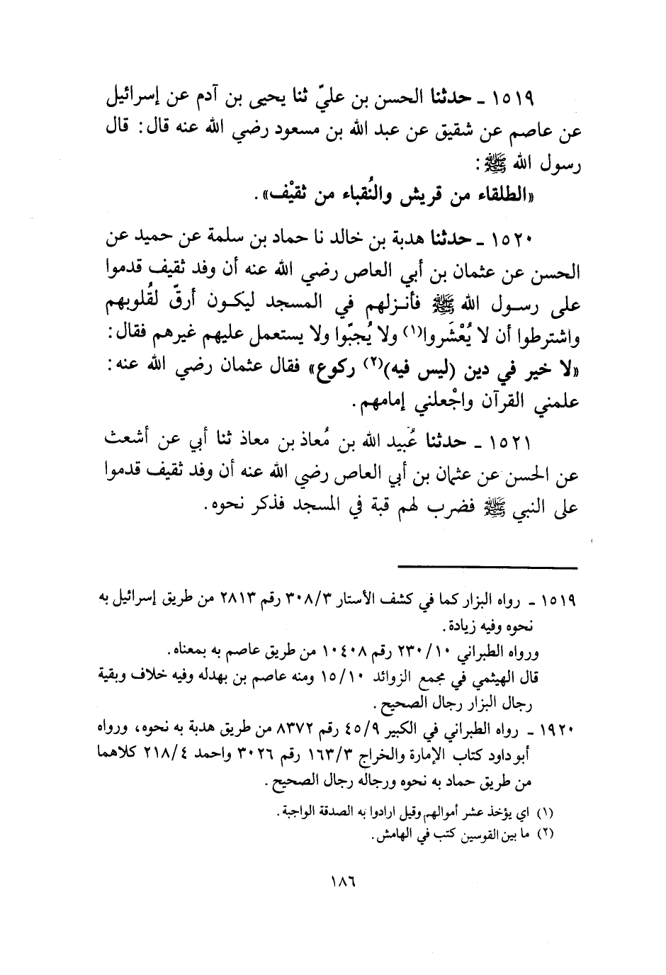 1520 - حَدَّثَنَا هُدْبَةُ بْنُ خَالِدٍ، نا حَمَّادُ بْنُ سَلَمَةَ، عَنْ حُمَيْدٍ، عَنِ الْحَسَنِ، عَنْ عُثْمَانَ بْنِ أَبِي الْعَاصِ رَضِيَ اللَّهُ عَنْهُ، أَنَّ وَفْدَ ثَقِيفٍ قَدِمُوا عَلَى رَسُولِ اللَّهِ صَلَّى اللهُ عَلَيْهِ وَسَلَّمَ فَأَنْزَلَهُمْ فِي الْمَسْجِدِ لِيَكُونَ أَرَقَّ لِقُلُوبِهِمْ، وَاشْتَرَطُوا أَنْ لَا يُعْشَرُوا وَلَا يُجِبُّوا وَلَا يَسْتَعْمِلَ عَلَيْهِمْ غَيْرُهِمْ. فَقَالَ: «§لَا خَيْرَ فِي دِينٍ لَيْسَ فِيهِ رُكُوعٌ» فَقَالَ عُثْمَانُ رَضِيَ اللَّهُ عَنْهُ: عَلِّمْنِي الْقُرْآنَ وَاجْعَلْنِي إِمَامَهُمْ.