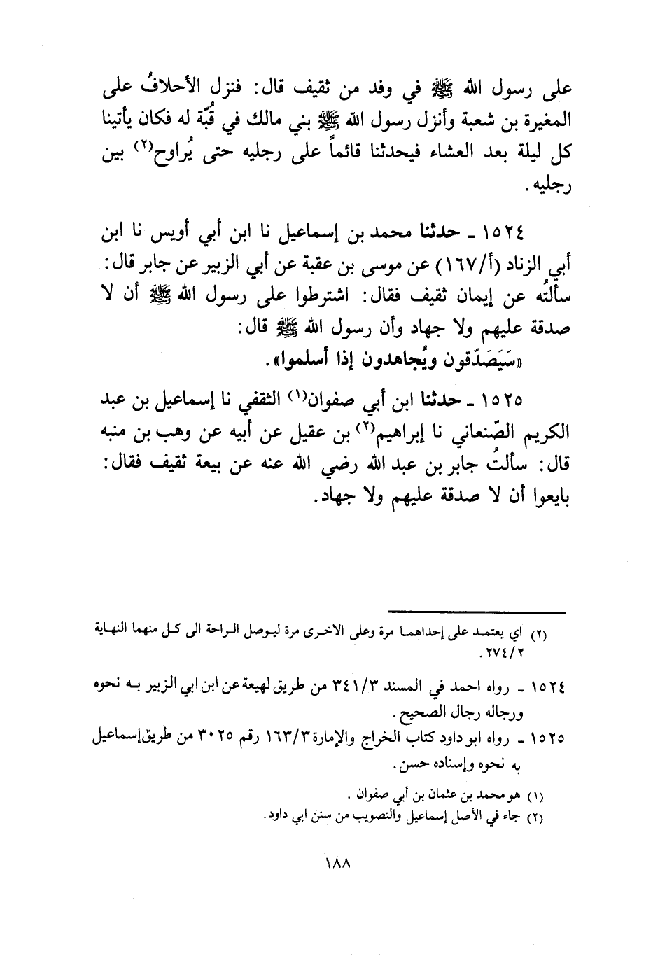 1524 - حَدَّثَنَا مُحَمَّدُ بْنُ إِسْمَاعِيلَ، نا ابْنُ أَبِي أُوَيْسَ، نا ابْنُ أَبِي الزِّنَادِ، عَنْ مُوسَى بْنِ عُقْبَةَ، عَنْ أَبِي الزُّبَيْرِ، عَنْ جَابِرٍ قَالَ: " §سَأَلْتُهُ عَنْ إِيمَانِ ثَقِيفٍ فَقَالَ اشْتَرَطُوا عَلَى رَسُولِ اللَّهِ صَلَّى اللهُ عَلَيْهِ وَسَلَّمَ أَنْ لَا صَدَقَةَ عَلَيْهِمْ وَلَا جِهَادَ، وَأَنَّ رَسُولَ اللَّهِ صَلَّى اللهُ عَلَيْهِ وَسَلَّمَ قَالَ: «سَيَصَّدَّقُونَ وَيُجَاهِدُونَ إِذَا أَسْلَمُوا»
