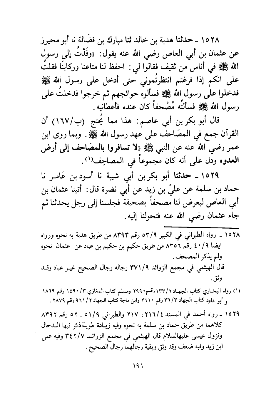 1528 - حَدَّثَنَا هُدْبَةُ بْنُ خَالِدٍ، ثنا مُبَارَكُ بْنُ فَضَالَةَ، نا أَبُو مُحَيْرِزٍ، عَنْ عُثْمَانَ بْنِ أَبِي الْعَاصِ، رَضِيَ اللَّهُ عَنْهُ يَقُولُ: وَفَدْتُ إِلَى رَسُولِ اللَّهِ صَلَّى اللهُ عَلَيْهِ وَسَلَّمَ فِي أُنَاسٍ مِنْ ثَقِيفٍ فَقَالُوا لِي: احْفَظْ لَنَا مَتَاعَنَا وَرِكَابَنَا. فَقُلْتُ: عَلَى أَنَّكُمْ إِذَا فَرَغْتُمُ انْتَظَرْتُمُونِي حَتَّى أَدْخُلَ عَلَى رَسُولِ اللَّهِ صَلَّى اللهُ عَلَيْهِ وَسَلَّمَ فَدَخَلُوا عَلَى رَسُولِ اللَّهِ صَلَّى اللهُ عَلَيْهِ وَسَلَّمَ فَسَأَلُوهُ حَوَائِجَهُمْ ثُمَّ خَرَجُوا، «§فَدَخَلْتُ عَلَى رَسُولِ اللَّهِ صَلَّى اللهُ عَلَيْهِ وَسَلَّمَ فَسَأَلْتُهُ مُصْحَفًا كَانَ عِنْدَهُ فَأَعْطَانِيهِ» قَالَ أَبُو بَكْرِ بْنُ أَبِي عَاصِمٍ: هَذَا مِمَّا يُحْتَجُّ أَنَّ الْقُرْآنَ جُمِعَ فِي الْمَصَاحِفِ عَلَى عَهْدِ رَسُولِ اللَّهِ صَلَّى اللهُ عَلَيْهِ وَسَلَّمَ وَبِمَا رَوَى ابْنُ عُمَرَ رَضِيَ اللَّهُ عَنْهُ، عَنِ النَّبِيِّ صَلَّى اللهُ عَلَيْهِ وَسَلَّمَ: «لَا تُسَافِرُوا بِالْمَصَاحِفِ إِلَى أَرْضِ الْعَدُوِّ» . وَدَلَّ عَلَى أَنَّهُ كَانَ مَجْمُوعًا فِي الْمَصَاحِفِ