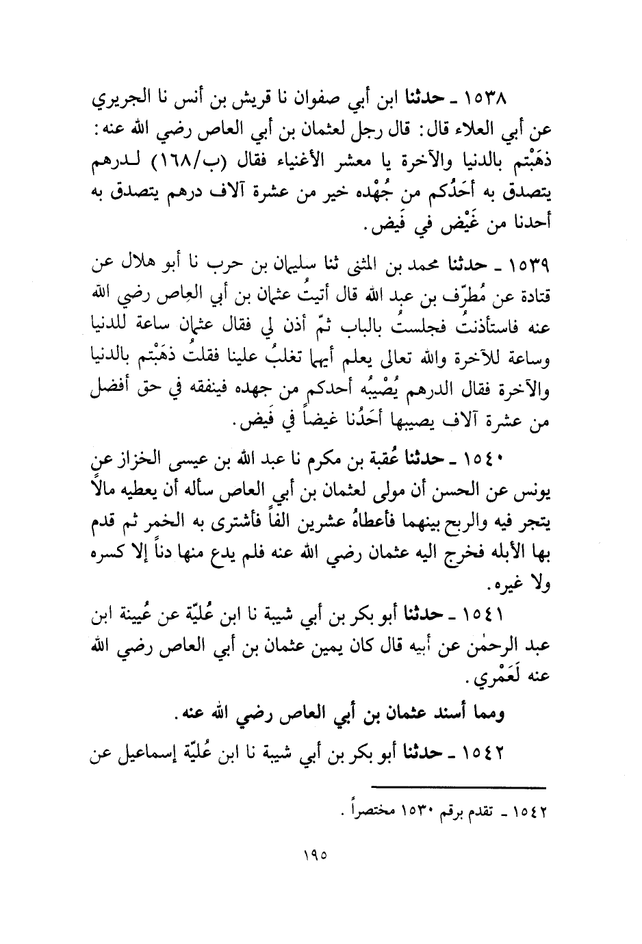1540 - حَدَّثَنَا عُقْبَةُ بْنُ مُكْرَمٍ، نا عَبْدُ اللَّهِ بْنُ عِيسَى الْخَزَّازُ، عَنْ يُونُسَ، عَنِ الْحَسَنِ، أَنَّ مَوْلًى لِعُثْمَانَ بْنِ أَبِي الْعَاصِ سَأَلَهُ «§أَنْ يُعْطِيَهُ مَالًا يَتْجِرُ فِيهِ وَالرِّبْحُ بَيْنَهُمَا فَأَعْطَاهُ عِشْرِينَ أَلْفًا فَاشْتَرَى بِهِ الْخَمْرَ، ثُمَّ قَدِمَ بِهَا الْأُبُلَّةَ فَخَرَجَ إِلَيْهِ عُثْمَانُ رَضِيَ اللَّهُ عَنْهُ فَلَمْ يَدَعْ مِنْهَا دِنًّا إِلَّا كَسَرَهُ وَلَا غَيْرَهُ»