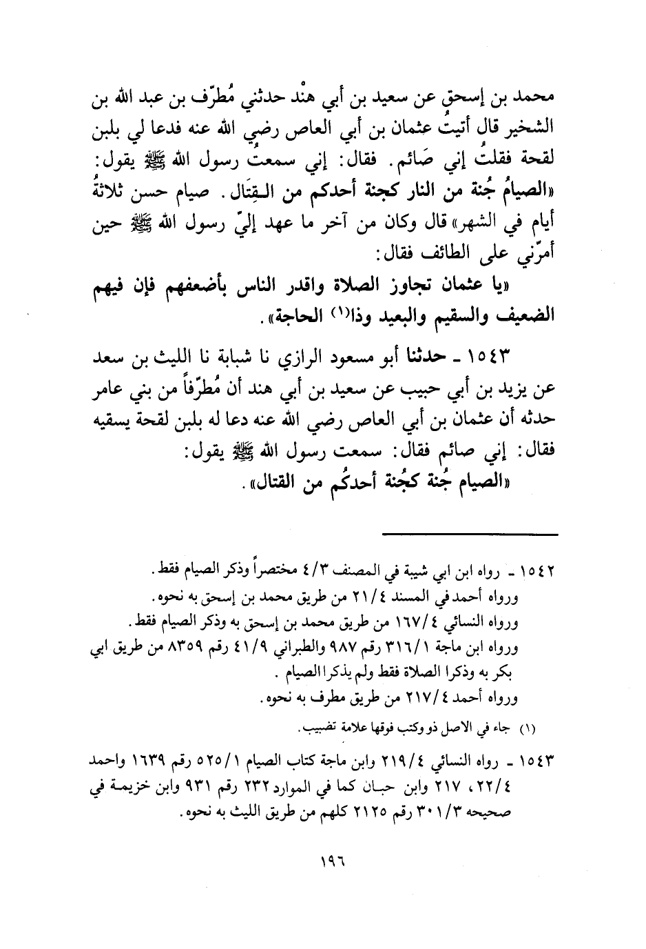 1543 - حَدَّثَنَا أَبُو مَسْعُودٍ الرَّازِيُّ، نا شَبَابَةُ، نا اللَّيْثُ بْنُ سَعْدٍ، عَنْ يَزِيدَ بْنِ أَبِي حَبِيبٍ، عَنْ سَعِيدِ بْنِ أَبِي هِنْدَ، أَنَّ مُطَرِّفًا، مِنْ بَنِي عَامِرٍ حَدَّثَهُ أَنَّ عُثْمَانَ بْنَ أَبِي الْعَاصِ رَضِيَ اللَّهُ عَنْهُ دَعَا لَهُ بِلَبَنِ لِقْحَةٍ يَسْقِيهُ فَقَالَ: إِنِّي صَائِمٌ. فَقَالَ سَمِعْتُ رَسُولَ اللَّهِ صَلَّى اللهُ عَلَيْهِ وَسَلَّمَ يَقُولُ: «§الصِّيَامُ جُنَّةٌ كَجُنَّةِ أَحَدِكُمْ مِنَ الْقِتَالِ» قَالَ أَبُو بَكْرِ بْنُ أَبِي عَاصِمٍ: وَرَوَاهُ عَنْ عُثْمَانَ، عَنِ النَّبِيِّ صَلَّى اللهُ عَلَيْهِ وَسَلَّمَ: «فِي الصِّيَامِ جُنَّةٌ» أَبُو الْعَلَاءِ، عَنْ مُطَرِّفٍ، وَرَوَى عَنِ النَّبِيِّ صَلَّى اللهُ عَلَيْهِ وَسَلَّمَ عُثْمَانُ فِي الْإِمَامَةِ مُطَرِّفُ بْنُ عَبْدِ اللَّهِ وَأَشْيَاخٌ مِنْ ثَقِيفٍ ذَكَرَ عَنْهُمُ النُّعْمَانُ بْنُ سَالِمٍ أَوْ سَالِمِ بْنِ النُّعْمَانِ رَوَى عَنْهُ سِمَاكُ بْنُ حَرْبٍ، وَحَكِيمُ بْنُ حَكِيمِ بْنِ عَبَّادِ بْنِ حُنَيْفٍ وَسَعِيدُ بْنُ الْمُسَيِّبِ، وَمُوسَى بْنِ طَلْحَةَ وَمُحَمَّدُ بْنُ سَعِيدِ بْنِ عَبْدِ الْمَلِكِ الطَّائِفِيُّ، وَدَاوُدُ بْنُ أَبِي عَاصِمٍ، وَالْحَارِثُ أَبُو عَمْرِو بْنُ الْحَارِثِ