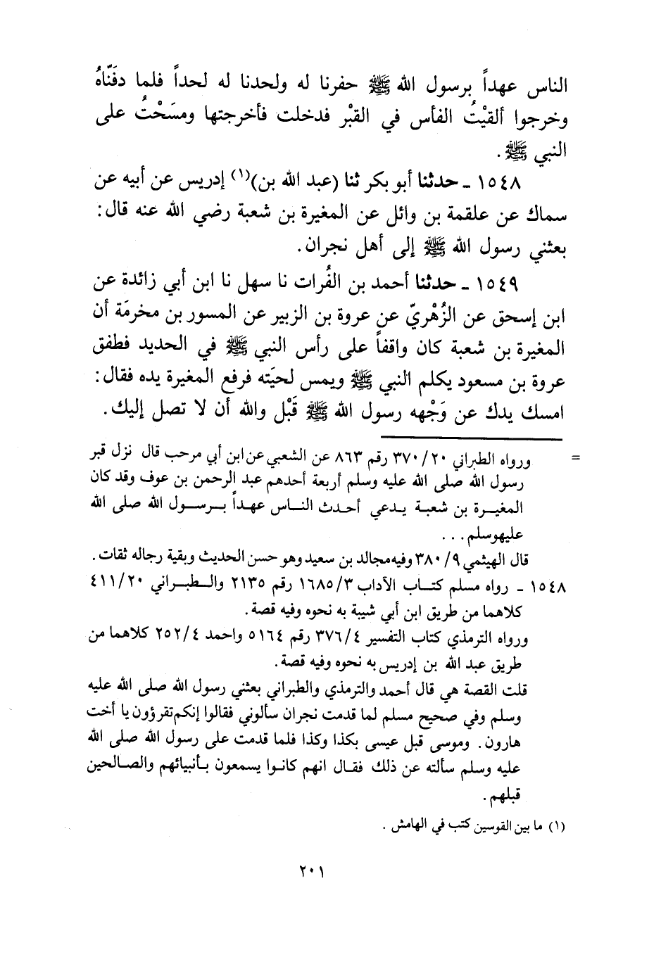1549 - حَدَّثَنَا أَحْمَدُ بْنُ الْفُرَاتِ، نا سَهْلٌ، نا ابْنُ أَبِي زَائِدَةَ، عَنِ ابْنِ إِسْحَاقَ، عَنِ الزُّهْرِيِّ، عَنْ عُرْوَةَ بْنِ الزُّبَيْرِ، عَنِ الْمِسْوَرِ بْنِ مَخْرَمَةَ، أَنَّ الْمُغِيرَةَ بْنَ شُعْبَةَ كَانَ وَاقِفًا عَلَى رَأْسِ النَّبِيِّ صَلَّى اللهُ عَلَيْهِ وَسَلَّمَ فِي الْحَدِيدِ فَطَفِقَ عُرْوَةُ بْنُ مَسْعُودٍ يُكَلِّمُ النَّبِيَّ صَلَّى اللهُ عَلَيْهِ وَسَلَّمَ، وَيَمَسُّ لِحْيَتَهُ فَرَفَعَ الْمُغِيرَةُ يَدَهُ فَقَالَ: «§أَمْسِكْ يَدَكَ عَنْ وَجْهِ رَسُولِ اللَّهِ صَلَّى اللهُ عَلَيْهِ وَسَلَّمَ قَبْلَ وَاللَّهِ أَنْ لَا تَصِلَ إِلَيْكَ»