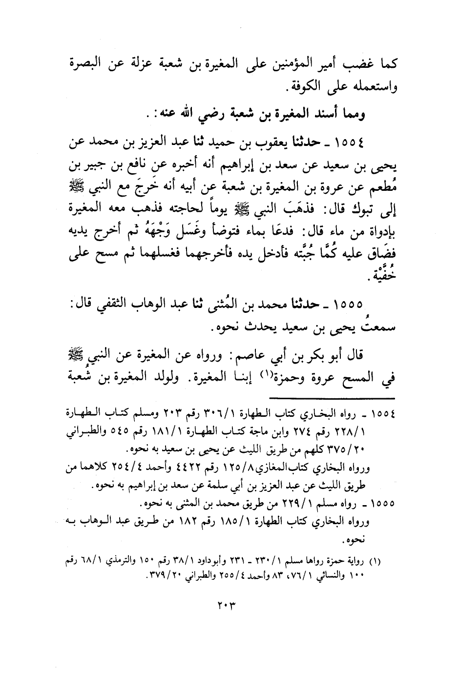 1555 - حَدَّثَنَا مُحَمَّدُ بْنُ الْمُثَنَّى، ثنا عَبْدُ الْوَهَّابِ الثَّقَفِيُّ قَالَ: سَمِعْتُ يَحْيَى بْنَ سَعِيدٍ يُحَدِّثُ نَحْوَهُ، قَالَ أَبُو بَكْرِ بْنِ أَبِي عَاصِمٍ وَرَوَاهُ عَنِ الْمُغِيرَةِ، عَنِ النَّبِيِّ صَلَّى اللهُ عَلَيْهِ وَسَلَّمَ فِي الْمَسْحِ عُرْوَةُ وَحَمْزَةُ ابْنَا الْمُغِيرَةِ وَلِوَلَدِ الْمُغِيرَةِ بْنِ شُعْبَةَ -[204]- طُرُقٌ وَوُجُوهٌ حِسَانٌ، وَرَوَاهُ أَيْضًا عَنِ الْمُغِيرَةِ وَرَّادٌ كَانَ الْمُغِيرَةُ وَوَرَّادٌ مَعَ قِلَّةِ حَدِيثِهِ يُكْثِرُ مَنْ حَدَّثَ عَنْهُ مِنَ الثِّقَاتِ مِمَّنْ حَدَّثَ عَنْ وَرَّادٍ الشَّعْبِيِّ وَعَبْدُ الْمَلَكِ بْنُ عُمَيْرٍ وَالْمُسَيَّبُ بْنُ رَافِعٍ، وَمُحَمَّدُ بْنُ عُبَيْدِ اللَّهِ الثَّقَفِيُّ وَعَبْدَةُ بْنُ أَبِي لُبَابَةَ، وَعَبْدُ رَبِّهِ يُحَدِّثُ عَنْهُ الْجُرَيْرِيُّ وَرَجَاءُ بْنُ حَيْوَةَ، وَابْنُ عَوْنٍ، وَالْجُرَيْرِيُّ، وَرَوَاهُ مَسْرُوقٌ، عَنِ الْمُغِيرَةِ، عَنِ النَّبِيِّ صَلَّى اللهُ عَلَيْهِ وَسَلَّمَ فِي الْمَسْحِ أَبُو وَائِلٍ وَالشَّعْبِيُّ وَعَلِيُّ بْنُ رَبِيعَةَ وَإِبْرَاهِيمُ بْنُ أَبِي مُوسَى، وَهُذَيْلٌ، وَابْنُ أَبِي نُعْمٍ وَعَمْرُو بْنُ وَهْبٍ، وَفَضَالَةُ الزَّهْرَانِيُّ، وَزُرَارَةُ بْنُ أَوْفَى، وَالْحَسَنُ بْنُ أَبِي الْحَسَنِ، وَأَبُو سَلَمَةَ بْنُ عَبْدِ الرَّحْمَنِ، وَأَبُو السَّائِبِ مَوْلَى بَنِي زُهْرَةَ، وَأَبُو إِدْرِيسَ الْخَوْلَانِيُّ وَقَدْ ذَكَرَنَا فِي كِتَابٍ