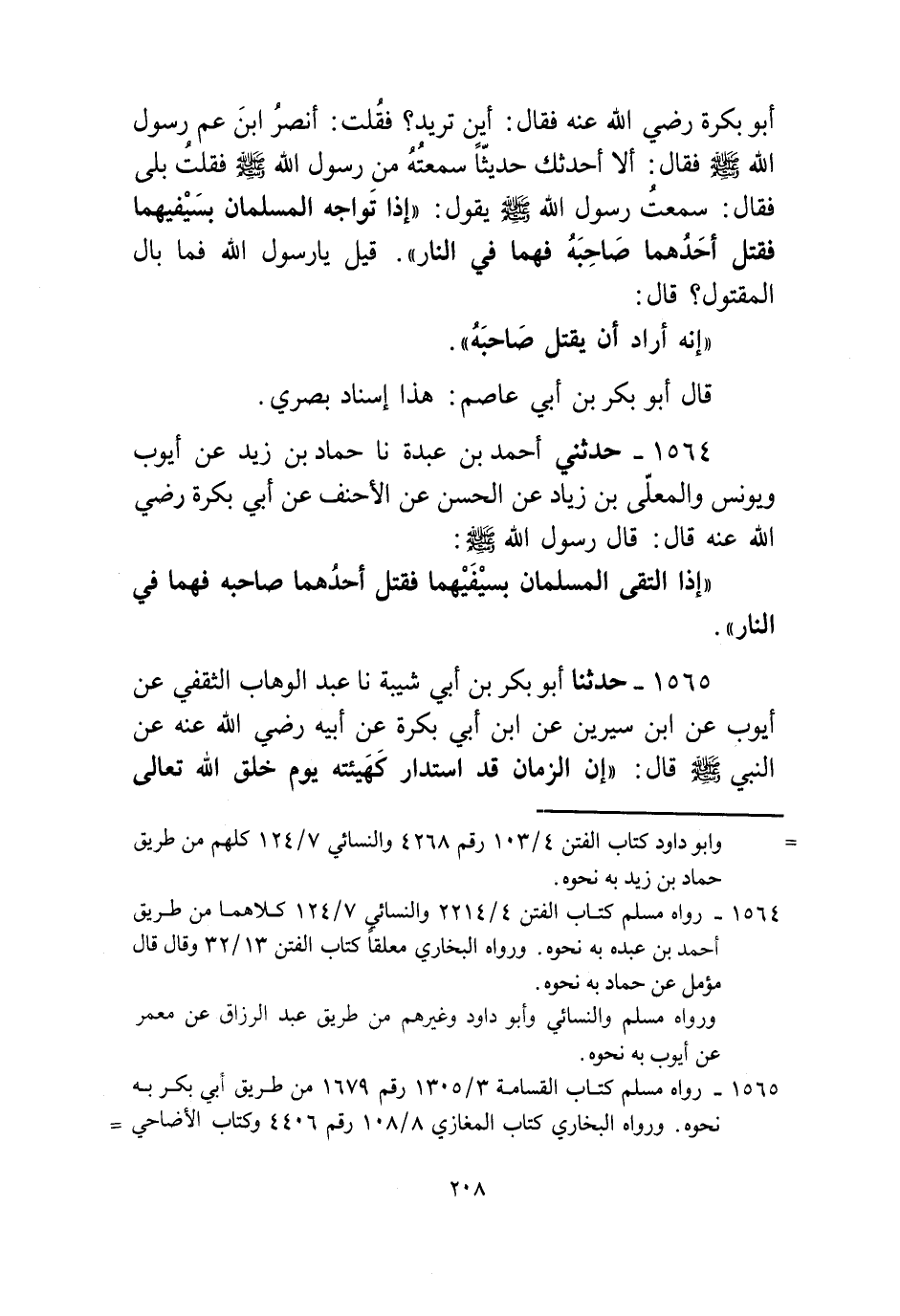 1564 - حَدَّثَنِي أَحْمَدُ بْنُ عَبْدَةَ، نا حَمَّادُ بْنُ زَيْدٍ، عَنْ أَيُّوبَ، وَيُونُسَ، وَالْمُعَلَّى بْنِ زِيَادٍ، عَنِ الْحَسَنِ، عَنِ الْأَحْنَفِ، عَنْ أَبِي بَكْرَةَ رَضِيَ اللَّهُ عَنْهُ قَالَ: قَالَ رَسُولُ اللَّهِ صَلَّى اللهُ عَلَيْهِ وَسَلَّمَ: §إِذَا الْتَقَى الْمُسْلِمَانِ بِسَيْفَيْهِمَا فَقَتَلَ أَحَدُهُمَا صَاحِبَهُ فَهُمَا فِي النَّارِ "