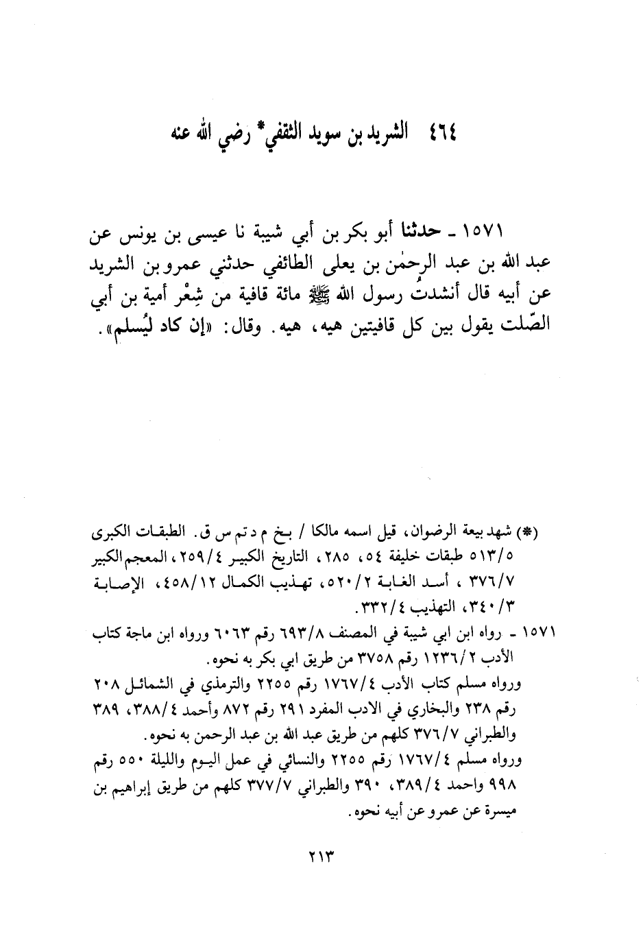 1571 - حَدَّثَنَا أَبُو بَكْرِ بْنُ أَبِي شَيْبَةَ، نا عِيسَى بْنُ يُونُسَ، عَنْ عَبْدِ اللَّهِ بْنِ عَبْدِ الرَّحْمَنِ بْنِ يَعْلَى الطَّائِفِيِّ، حَدَّثَنِي عَمْرُو بْنُ الشَّرِيدِ، عَنْ أَبِيهِ قَالَ: " §أَنْشَدْتُ رَسُولَ اللَّهِ صَلَّى اللهُ عَلَيْهِ وَسَلَّمَ مِائَةَ قَافِيَةٍ مِنْ شِعْرِ أُمَيَّةَ بْنِ أَبِي الصَّلْتِ يَقُولُ بَيْنَ كُلِّ قَافِيَتَيْنِ: «هِيهْ هِيهْ» . وَقَالَ: «إِنْ كَادَ لَيُسْلِمْ»
