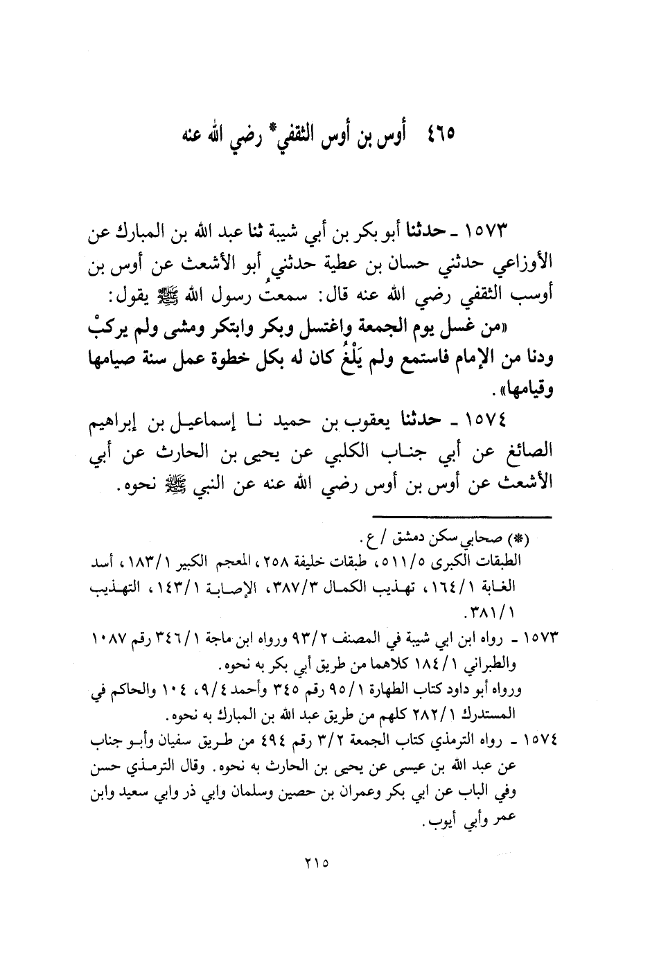 1574 - حَدَّثَنَا يَعْقُوبُ بْنُ حُمَيْدٍ، نا إِسْمَاعِيلُ بْنُ إِبْرَاهِيمَ الصَّائِغُ، عَنْ أَبِي جَنَابٍ الْكَلْبِيِّ، عَنْ يَحْيَى بْنِ الْحَارِثِ، عَنْ أَبِي الْأَشْعَثِ، عَنْ أَوْسِ بْنِ أَوْسٍ رَضِيَ اللَّهُ عَنْهُ، عَنِ النَّبِيِّ صَلَّى اللهُ عَلَيْهِ وَسَلَّمَ نَحْوَهُ -[216]-.