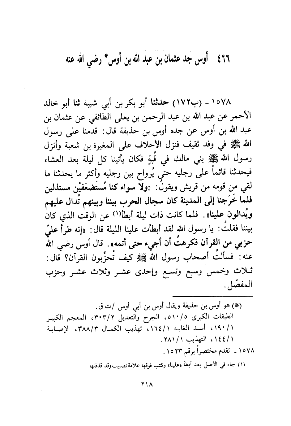 1578 - حَدَّثَنَا أَبُو بَكْرِ بْنُ أَبِي شَيْبَةَ، ثنا أَبُو خَالِدٍ الْأَحْمَرُ، عَنْ عَبْدِ اللَّهِ بْنِ عَبْدِ الرَّحْمَنِ بْنِ يَعْلَى الطَّائِفِيِّ، عَنْ عُثْمَانَ بْنِ عَبْدِ اللَّهِ بْنِ أَوْسٍ، عَنْ جَدِّهِ أَوْسِ بْنِ حُذَيْفَةَ قَالَ: «قَدِمْنَا عَلَى رَسُولِ اللَّهِ صَلَّى اللهُ عَلَيْهِ وَسَلَّمَ فِي وَفْدِ ثَقِيفٍ فَنَزَلَ الْأَحْلَافُ عَلَى الْمُغِيرَةِ بْنِ شُعْبَةَ وَأَنْزَلَ رَسُولُ اللَّهِ صَلَّى اللهُ عَلَيْهِ وَسَلَّمَ بَنِي مَالِكٍ فِي قُبَّةٍ،» §فَكَانَ يَأْتِينَا كُلَّ لَيْلَةٍ بَعْدَ الْعِشَاءِ فَيُحَدِّثُنَا قَائِمًا عَلَى رِجْلَيْهِ حَتَّى يُرَاوِحَ بَيْنَ رِجْلَيْهِ وَأَكْثَرُ مَا يُحَدِّثُنَا مَا لَقِيَ مِنْ قَوْمِهِ مِنْ قُرَيْشٍ وَيَقُولُ: «وَلَا سَوَاءٌ كُنَّا مُسْتَضْعَفِينَ مُسْتَذَلِّينَ فَلَمَّا خَرَجْنَا إِلَى الْمَدِينَةِ كَانَ سِجَالُ الْحَرْبِ بَيْنَنَا وَبَيْنَهُمْ تُدَالُ عَلَيْهِمْ وَيُدَالُونَ عَلَيْنَا» . فَلَمَّا كَانَتْ ذَاتَ لَيْلَةٍ أَبْطَأَ عَنِ الْوَقْتِ الَّذِي كَانَ بَيْنَنَا فَقُلْتُ: يَا رَسُولَ اللَّهِ لَقَدْ أَبْطَأْتَ عَلَيْنَا اللَّيْلَةَ قَالَ: «إِنَّهُ طَرَأعَلَيَّ حِزْبِي مِنَ الْقُرْآنِ فَكَرِهْتُ أَنْ أَجِيءَ حَتَّى أُتِمَّهُ» قَالَ أَوْسٌ رَضِيَ اللَّهُ عَنْهُ: فَسَأَلْتُ أَصْحَابَ رَسُولِ اللَّهِ صَلَّى اللهُ عَلَيْهِ وَسَلَّمَ: كَيْفَ تُحَزِّبُونَ الْقُرْآنَ؟ قَالَ: ثَلَاثٌ وَخَمْسٌ وَسَبْعٌ وَتِسْعٌ وَإِحْدَى عَشَرَ وَثَلَاثَ عَشَرَ وَحِزْبُ الْمُفَصَّلِ "