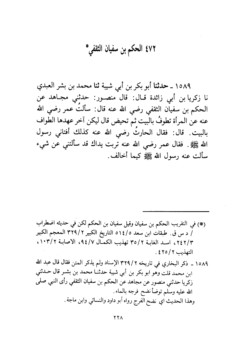 1589 - حَدَّثَنَا أَبُو بَكْرِ بْنُ أَبِي شَيْبَةَ، ثنا مُحَمَّدُ بْنُ بِشْرٍ الْعَبْدِيُّ، نا زَكَرِيَا بْنُ أَبِي زَائِدَةَ قَالَ: قَالَ مَنْصُورٌ: حَدَّثَنِي مُجَاهِدٌ، عَنِ الْحَكَمِ بْنِ سُفْيَانَ الثَّقَفِيِّ رَضِيَ اللَّهُ عَنْهُ قَالَ: سَأَلْتُ عُمَرَ رَضِيَ اللَّهُ عَنْهُ عَنِ " الْمَرْأَةِ تَطُوفُ بِالْبَيْتِ ثُمَّ تَحِيضُ. قَالَ: §لِيَكُنْ آخِرَ عَهْدِهَا الطَّوَافُ بِالْبَيْتِ. قَالَ: فَقَالَ الْحَارِثُ رَضِيَ اللَّهُ عَنْهُ: كَذَلِكَ أَفْتَانِي رَسُولُ اللَّهِ صَلَّى اللهُ عَلَيْهِ وَسَلَّمَ فَقَالَ عُمَرُ رَضِيَ اللَّهُ عَنْهُ: تَرِبَتْ يَدَاكَ قَدْ سَأَلَتْنِي عَنْ شَيْءٍ سَأَلْتُ عَنْهُ رَسُولَ اللَّهِ صَلَّى اللهُ عَلَيْهِ وَسَلَّمَ كَيْمَا أُخَالِفَ "