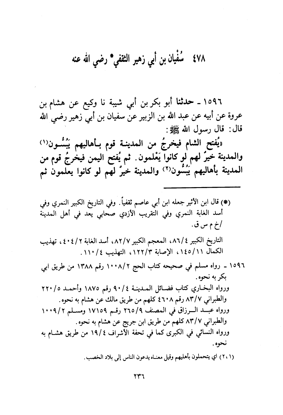 1596 - حَدَّثَنَا أَبُو بَكْرِ بْنُ أَبِي شَيْبَةَ، نا وَكِيعٌ، عَنْ هِشَامِ بْنِ عُرْوَةَ، عَنْ أَبِيهِ، عَنْ عَبْدِ اللَّهِ بْنِ الزُّبَيْرِ، عَنْ سُفْيَانَ بْنِ أَبِي زُهَيْرٍ رَضِيَ اللَّهُ عَنْهُ قَالَ: قَالَ رَسُولُ اللَّهِ صَلَّى اللهُ عَلَيْهِ وَسَلَّمَ: «§يُفْتَحُ الشَّامُ فَيَخْرُجُ مِنَ الْمَدِينَةِ قَوْمٌ بِأَهْالِيهِمْ يَبُسُّونَ وَالْمَدِينَةُ خَيْرٌ لَهُمْ لَوْ كَانُوا يَعْلَمُونَ، ثُمَّ يُفْتَحُ الْيَمَنُ فَيَخْرُجُ قَوْمٌ مِنَ الْمَدِينَةِ بِأَهْالِيهِمْ يَبُسُّونَ وَالْمَدِينَةُ خَيْرٌ لَهُمْ لَوْ كَانُوا يَعْلَمُونَ. ثُمَّ يُفْتَحُ الْعِرَاقُ فَيَخْرُجُ قَوْمٌ مِنَ الْمَدِينَةِ بِأَهْالِيهِمْ يَبُسُّونَ وَالْمَدِينَةُ خَيْرٌ لَهُمْ لَوْ كَانُوا يَعْلَمُونَ»