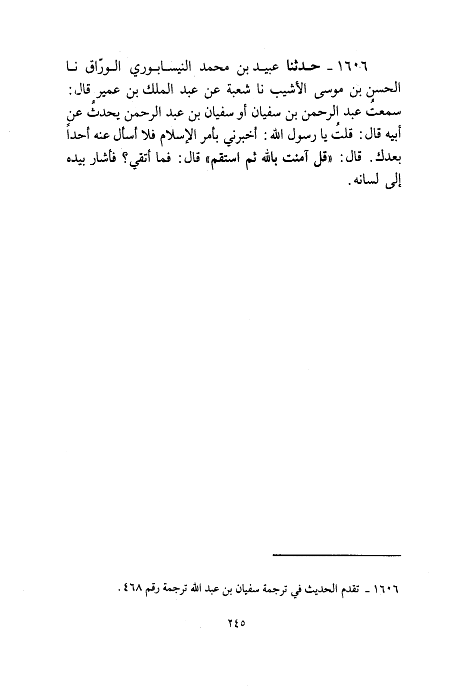 1606 - حَدَّثَنَا عُبَيْدُ بْنُ مُحَمَّدٍ النَّيْسَابُورِيُّ الْوَرَّاقُ، نا الْحَسَنُ بْنُ مُوسَى الْأَشْيَبُ، نا شُعْبَةُ، عَنْ عَبْدِ الْمَلِكِ بْنِ عُمَيْرٍ قَالَ: سَمِعْتُ عَبْدَ الرَّحْمَنِ بْنَ سُفْيَانَ، أَوْ سُفْيَانَ بْنَ عَبْدِ الرَّحْمَنِ يُحَدِّثُ عَنْ أَبِيهِ قَالَ: قُلْتُ: يَا رَسُولَ اللَّهِ أَخْبِرْنِي بِأَمْرِ الْإِسْلَامِ فَلَا أَسْأَلُ عَنْهُ أَحَدًا بَعْدَكَ. قَالَ: " §قُلْ: آمَنْتُ بِاللَّهِ ثُمَّ اسْتَقِمْ ". قَالَ: فَمَا أَتَّقِي؟ فَأَشَارَ بِيَدِهِ إِلَى لِسَانِهِ "