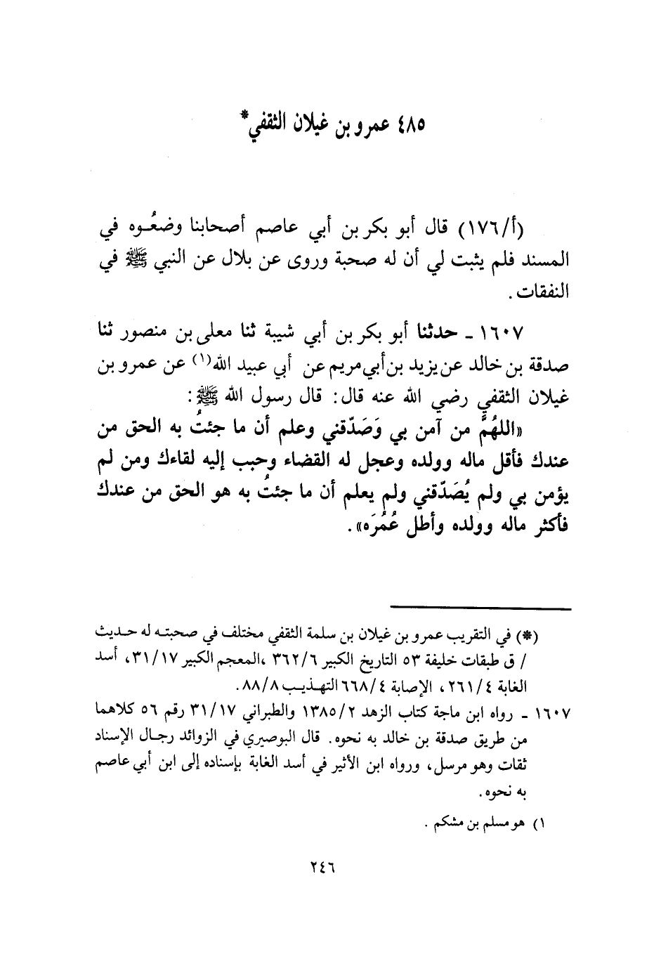 1607 - حَدَّثَنَا أَبُو بَكْرِ بْنُ أَبِي شَيْبَةَ، ثنا مُعَلَّى بْنُ مَنْصُورٍ، ثنا صَدَقَةُ بْنُ خَالِدٍ، عَنْ يَزِيدَ بْنِ أَبِي مَرْيَمَ، عَنْ أَبِي عُبَيْدِ اللَّهِ، عَنْ عَمْرِو بْنِ غَيْلَانَ الثَّقَفِيِّ رَضِيَ اللَّهُ عَنْهُ قَالَ: قَالَ رَسُولُ اللَّهِ صَلَّى اللهُ عَلَيْهِ وَسَلَّمَ: «§اللَّهُمَّ مَنْ آمَنَ بِي وَصَدَّقَنِي وَعَلِمَ أَنَّ مَا جِئْتُ بِهِ الْحَقَّ مِنْ عِنْدِكَ فَأَقِلَّ مَالَهُ وَوَلَدَهُ وَعَجِّلْ لَهُ الْقَضَاءَ وَحَبِّبْ إِلَيْهِ لِقَاءَكَ، وَمَنْ لَمْ يُؤْمِنْ بِي وَلَمْ يُصَدِّقْنِي وَلَمْ يَعْلَمْ أَنَّ مَا جِئْتُ بِهِ هُوَ الْحَقُّ مِنْ عِنْدِكَ فَأَكْثِرْ مَالَهُ وَوَلَدَهُ وَأَطِلْ عُمْرَهُ»