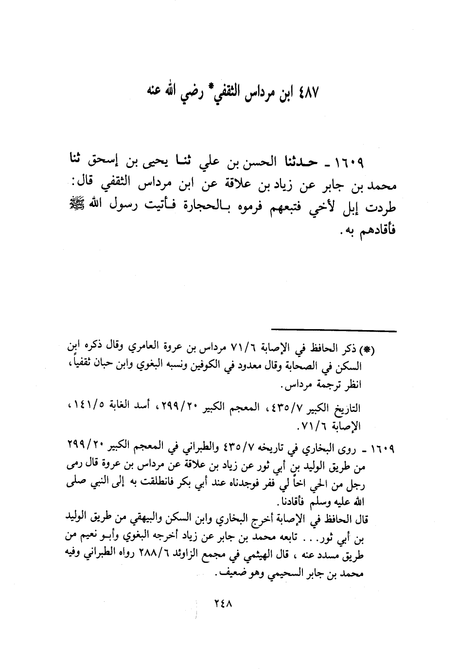 1609 - حَدَّثَنَا الْحَسَنُ بْنُ عَلِيٍّ، ثنا يَحْيَى بْنُ إِسْحَاقَ، ثنا مُحَمَّدُ بْنُ جَابِرٍ، عَنْ زِيَادِ بْنِ عِلَاقَةَ، عَنِ ابْنِ مِرْدَاسٍ الثَّقَفِيِّ قَالَ: «§طُرِدَتْ إِبِلٌ لِأَخِي فَتَبِعَهُمْ فَرَمَوْهُ بِالْحِجَارَةِ فَأَتَيْتُ رَسُولَ اللَّهِ صَلَّى اللهُ عَلَيْهِ وَسَلَّمَ فَأَقَادَهُمْ بِهِ»