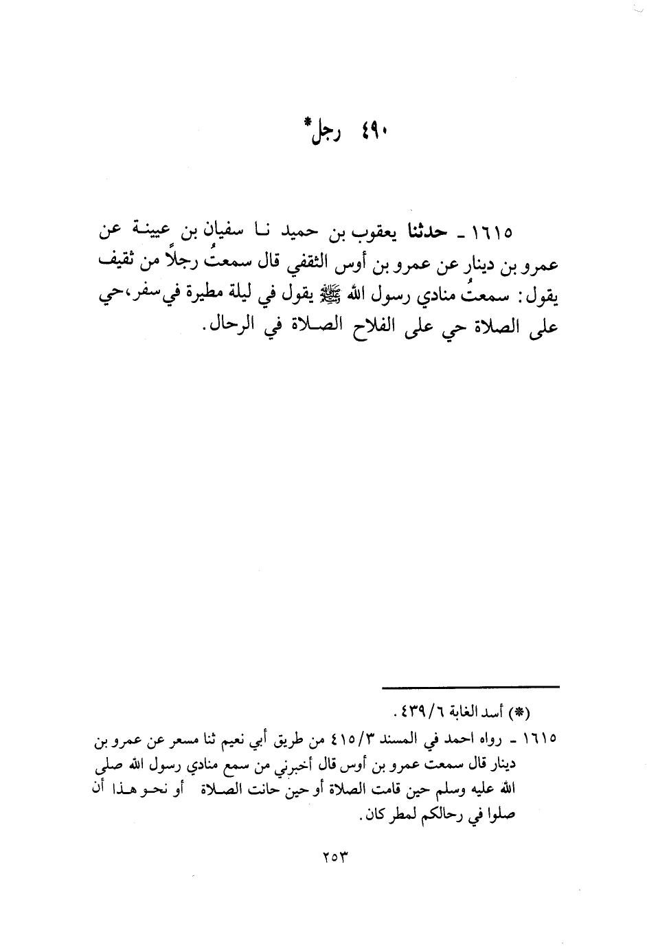 1615 - حَدَّثَنَا يَعْقُوبُ بْنُ حُمَيْدٍ، نا سُفْيَانُ بْنُ عُيَيْنَةَ، عَنْ عَمْرِو بْنِ دِينَارٍ، عَنْ عَمْرِو بْنِ أَوْسٍ الثَّقَفِيِّ قَالَ: سَمِعْتُ رَجُلًا مِنْ ثَقِيفٍ يَقُولُ: " §سَمِعْتُ مُنَادِي رَسُولِ اللَّهِ صَلَّى اللهُ عَلَيْهِ وَسَلَّمَ يَقُولُ فِي لَيْلَةٍ مَطِيرَةٍ فِي سَفَرٍ: حَيَّ عَلَى الصَّلَاةِ حَيَّ عَلَى الْفَلَاحِ الصَّلَاةُ فِي الرِّحَالِ "