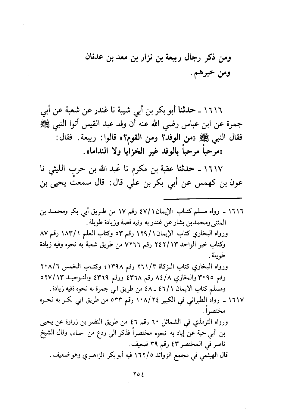 1616 - حَدَّثَنَا أَبُو بَكْرِ بْنُ أَبِي شَيْبَةَ، نا غُنْدَرٌ، عَنْ شُعْبَةَ، عَنْ أَبِي جَمْرَةَ، عَنِ ابْنِ عَبَّاسٍ رَضِيَ اللَّهُ عَنْهُ أَنَّ وَفْدَ عَبْدِ الْقَيْسِ أَتَوُا النَّبِيَّ صَلَّى اللهُ عَلَيْهِ وَسَلَّمَ فَقَالَ النَّبِيُّ صَلَّى اللهُ عَلَيْهِ وَسَلَّمَ: «§مَنِ الْوَفْدُ وَمَنِ الْقَوْمُ؟» قَالُوا: رَبِيعَةُ. فَقَالَ: مَرْحَبًا مَرْحَبًا بِالْوَفْدِ غَيْرِ الْخَزَايَا وَلَا النَّدَامَا "