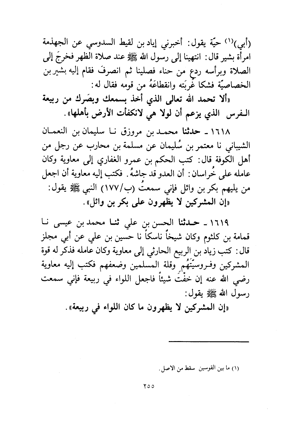 1618 - حَدَّثَنَا مُحَمَّدُ بْنُ مَرْزُوقٍ، نا سُلَيْمَانُ بْنُ النُّعْمَانِ الشَّيْبَانِيُّ، نا مُعْتَمِرُ بْنُ سُلَيْمَانَ، عَنْ مَسْلَمَةَ بْنِ مُحَارِبٍ، عَنْ رَجُلٍ مِنْ أَهْلِ الْكُوفَةِ قَالَ: كَتَبَ الْحَكَمُ بْنُ عَمْرٍو الْغِفَارِيُّ إِلَى مُعَاوِيَةَ وَكَانَ عَامِلَهُ عَلَى خُرَاسَانَ أَنَّ الْعَدُوَّ قَدْ جَاشَهُ، فَكَتَبَ إِلَيْهِ مُعَاوِيَةُ أَنِ اجْعَلْ مَنْ يَلِيهِمْ بَكْرَ بْنُ وَائِلٍ؛ فَإِنِّي سَمِعْتُ النَّبِيَّ صَلَّى اللهُ عَلَيْهِ وَسَلَّمَ يَقُولُ: «§إِنَّ الْمُشْرِكِينَ لَا يَظْهَرُونَ عَلَى بَكْرِ بْنِ وَائِلٍ»