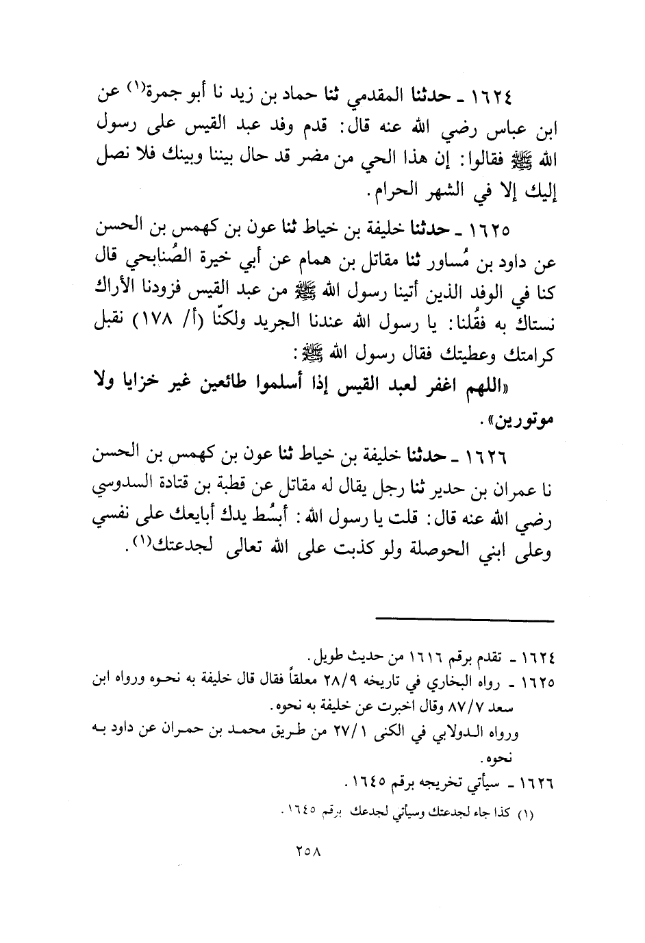 1625 - حَدَّثَنَا خَلِيفَةُ بْنُ خَيَّاطٍ، ثنا عَوْنُ بْنُ كَهْمَسِ بْنِ الْحَسَنِ، عَنْ دَاوُدَ بْنُ مُسَاوِرٍ، ثنا مُقَاتِلُ بْنُ هَمَّامٍ، عَنْ أَبِي خَيْرَةَ الصُّنَابِحِيِّ قَالَ: كُنَّا فِي الْوَفْدِ الَّذِينَ أَتَيْنَا رَسُولَ اللَّهِ صَلَّى اللهُ عَلَيْهِ وَسَلَّمَ مِنْ عَبْدِ الْقَيْسِ فَزَوَّدَنَا الْأَرَاكَ نَسْتَاكَ بِهِ فَقُلْنَا: يَا رَسُولَ اللَّهِ عِنْدَنَا الْجَرِيدُ وَلَكِنَّا نَقْبَلُ كَرَامَتَكَ وَعَطِيَّتَكَ فَقَالَ رَسُولُ اللَّهِ صَلَّى اللهُ عَلَيْهِ وَسَلَّمَ: «§اللَّهُمَّ اغْفِرْ لِعَبْدِ الْقَيْسِ إِذَا أَسْلَمُوا طَائِعِينَ غَيْرَ خَزَايَا وَلَا مَوْتُورِينَ»
