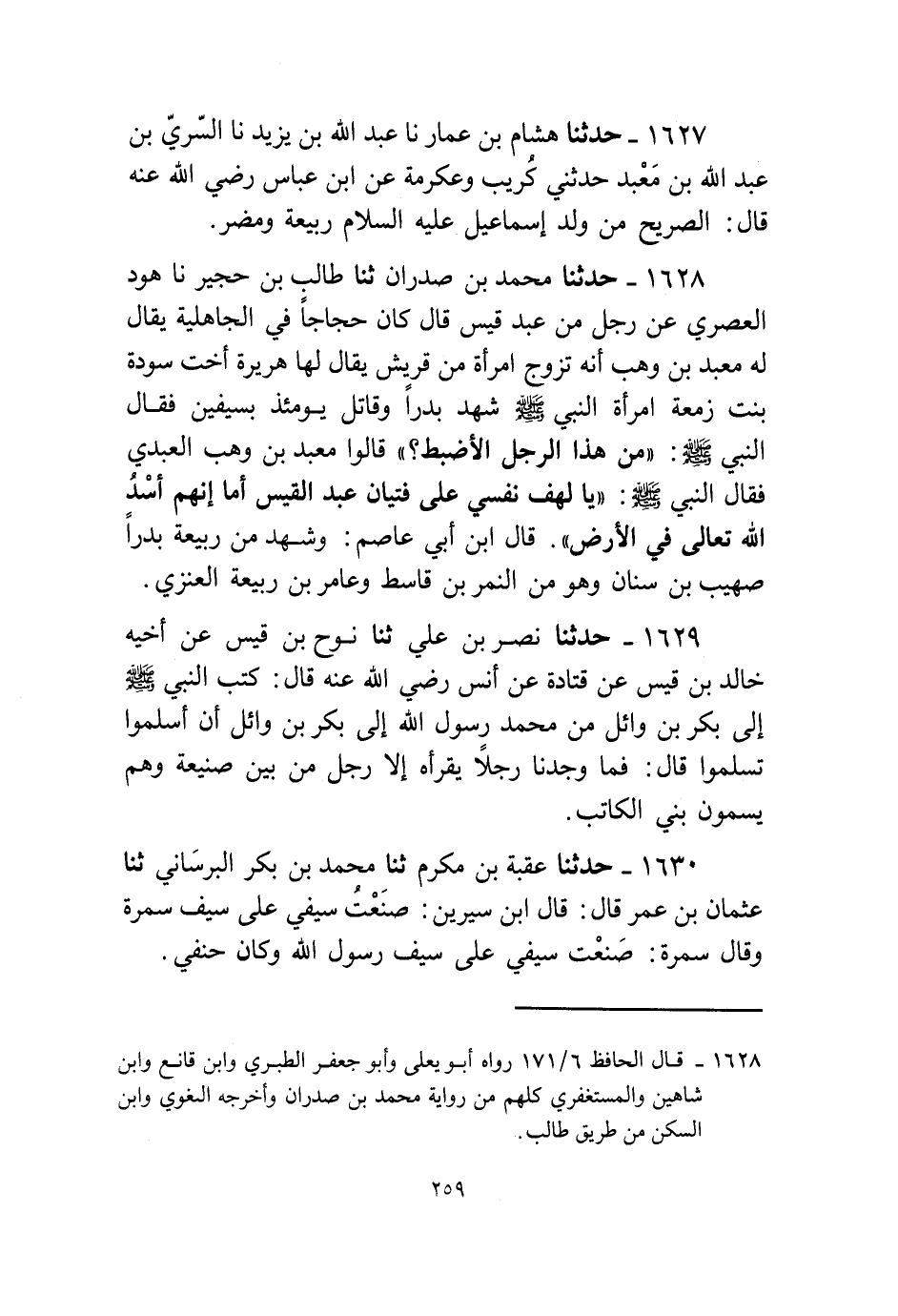 1628 - حَدَّثَنَا مُحَمَّدُ بْنُ صُدْرَانَ، ثنا طَالِبُ بْنُ حُجَيْرٍ، نا هُودٌ الْعَصَرِيُّ، عَنْ رَجُلٍ مِنْ عَبْدِ قَيْسٍ قَالَ: كَانَ حَجَّاجًا فِي الْجَاهِلِيَّةِ يُقَالُ لَهُ: مَعْبَدُ بْنُ وَهْبٍ أَنَّهُ تَزَوَّجَ امْرَأَةً مِنْ قُرَيْشٍ يُقَالُ لَهَا: هُرَيْرَةُ أُخْتُ سَوْدَةَ بِنْتِ زَمْعَةَ امْرَأَةِ النَّبِيِّ صَلَّى اللهُ عَلَيْهِ وَسَلَّمَ شَهِدَ بَدْرًا وَقَاتَلَ يَوْمَئِذٍ بِسَيْفَيْنِ فَقَالَ النَّبِيُّ صَلَّى اللهُ عَلَيْهِ وَسَلَّمَ: «مَنْ هَذَا الرَّجُلُ الْأَضْبَطُ؟» قَالُوا: مَعْبَدُ بْنُ وَهْبٍ الْعَبْدِيُّ. فَقَالَ النَّبِيُّ صَلَّى اللهُ عَلَيْهِ وَسَلَّمَ: «§يَا لَهْفَ نَفْسِي عَلَى فِتْيَانِ عَبْدِ الْقَيْسِ أَمَا إِنَّهُمْ أُسْدُ اللَّهِ تَعَالَى فِي الْأَرْضِ» قَالَ ابْنُ أَبِي عَاصِمٍ: «وَشَهِدَ مِنْ رَبِيعَةَ بَدْرًا صُهَيْبُ بْنُ سِنَانٍ، وَهُوَ مِنَ النَّمِرِ بْنِ قَاسِطٍ، وَعَامِرُ بْنُ رَبِيعَةَ الْعَنَزِيُّ»