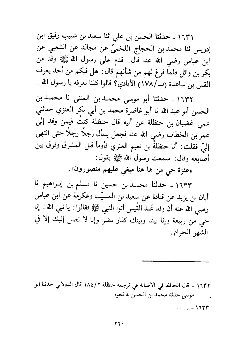 1631 - حَدَّثَنَا الْحَسَنُ بْنُ عَلِيٍّ، ثنا سَعِيدُ بْنُ شَبِيبٍ رَفِيقُ ابْنِ إِدْرِيسَ، ثنا مُحَمَّدُ بْنُ الْحَجَّاجِ اللَّخْمِيُّ، عَنْ مُجَالِدٍ، عَنِ الشَّعْبِيِّ، عَنِ ابْنِ عَبَّاسٍ رَضِيَ اللَّهُ عَنْهُ قَالَ: قَدِمَ عَلَى رَسُولِ اللَّهِ صَلَّى اللهُ عَلَيْهِ وَسَلَّمَ وَفْدٌ مِنْ بَكْرِ بْنِ وَائِلٍ فَلَمَّا فَرَغَ لَهُمْ مِنْ شَأْنِهِمْ قَالَ: «§هَلْ فِيكُمْ مِنْ أَحَدٍ يَعْرِفُ الْقِسَّ بْنَ سَاعِدَةَ الْإِيَادِيَّ؟» قَالُوا: كُلُّنَا نَعْرِفُهُ يَا رَسُولَ اللَّهِ "