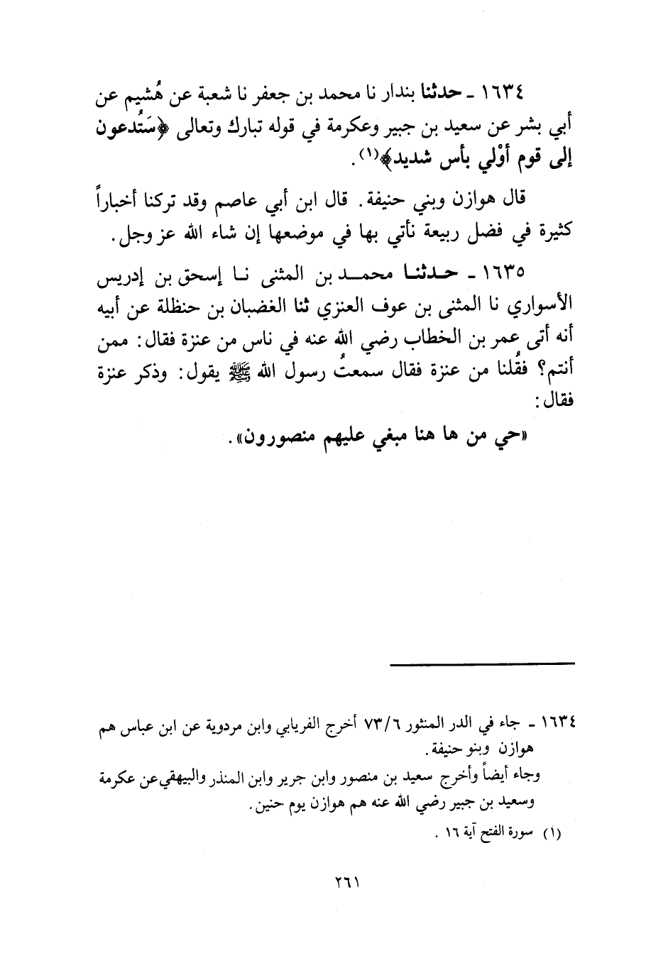 1634 - حَدَّثَنَا بُنْدَارٌ، نا مُحَمَّدُ بْنُ جَعْفَرٍ، نا شُعْبَةُ، عَنْ هُشَيْمٍ، عَنْ أَبِي بِشْرٍ، عَنْ سَعِيدِ بْنِ جُبَيْرٍ، وَعِكْرِمَةِ، فِي قَوْلِهِ تَبَارَكَ وَتَعَالَى: " {§سَتُدْعَوْنَ إِلَى قَوْمٍ أُولِي بَأْسٍ شَدِيدٍ} [الفتح: 16] قَالَ: هَوَازِنُ وَبَنِي حَنِيفَةَ قَالَ ابْنُ أَبِي عَاصِمٍ: وَقَدْ تَرَكْنَا أَخْبَارًا كَثِيرَةً فِي فَضْلِ رَبِيعَةَ نَأْتِي بِهَا فِي مَوْضِعِهَا إِنْ شَاءَ اللَّهُ عَزَّ وَجَلَّ