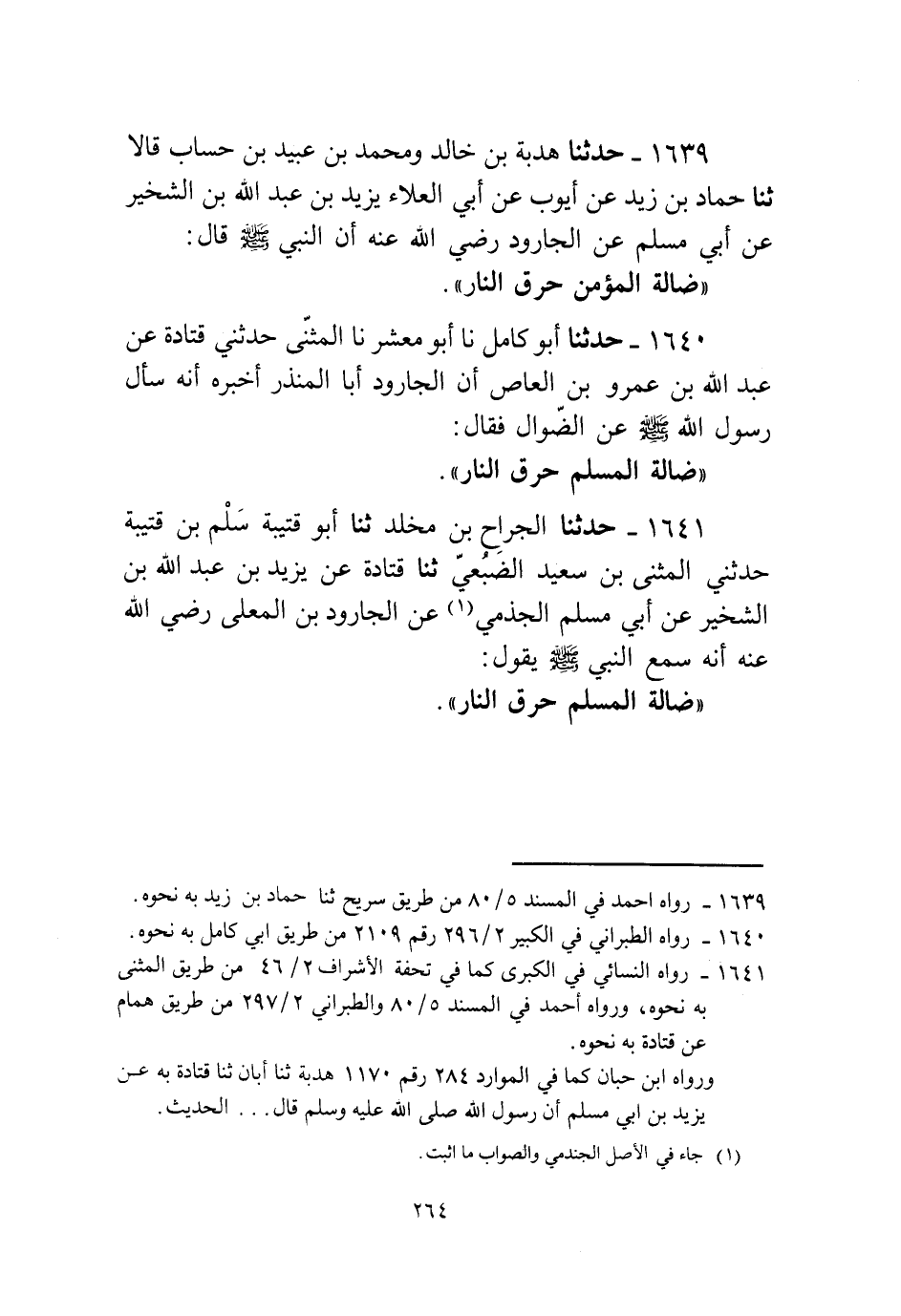 1639 - حَدَّثَنَا هُدْبَةُ بْنُ خَالِدٍ، وَمُحَمَّدُ بْنُ عُبَيْدِ بْنِ حِسَابٍ قَالَا: ثنا حَمَّادُ بْنُ زَيْدٍ، عَنْ أَيُّوبَ، عَنْ أَبِي الْعَلَاءِ يَزِيدَ بْنِ عَبْدِ اللَّهِ بْنِ الشِّخِّيرِ، عَنْ أَبِي مُسْلِمٍ، عَنِ الْجَارُودِ رَضِيَ اللَّهُ عَنْهُ، أَنَّ النَّبِيَّ صَلَّى اللهُ عَلَيْهِ وَسَلَّمَ قَالَ: «§ضَالَّةُ الْمُؤْمِنِ حَرَقُ النَّارِ»