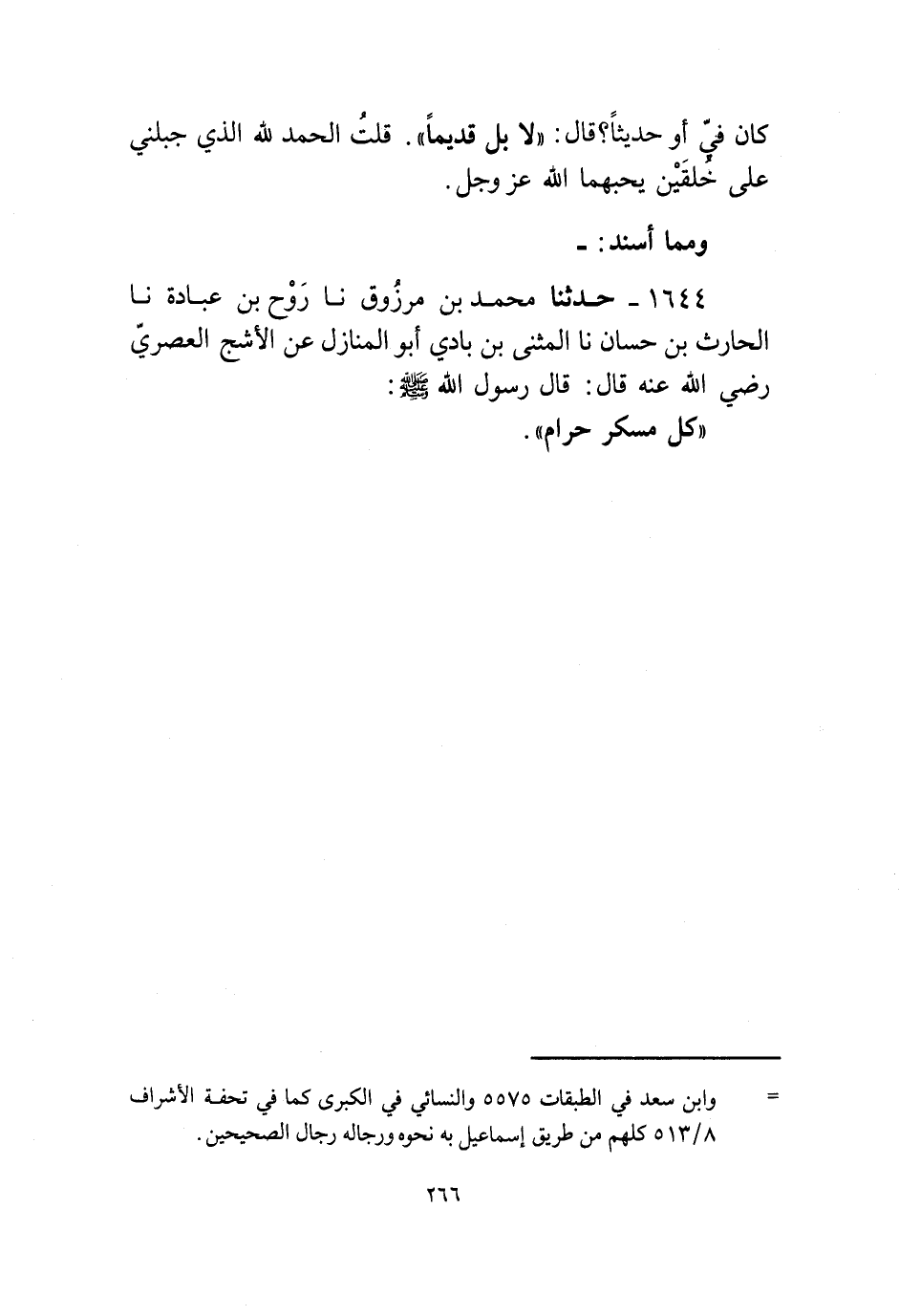 1644 - حَدَّثَنَا مُحَمَّدُ بْنُ مَرْزُوقٍ، نا رَوْحُ بْنُ عُبَادَةَ، نا الْحَارِثُ بْنُ حَسَّانَ، نا الْمُثَنَّى بْنُ بَادِيَ أَبُو الْمُنَازِلِ، عَنِ الْأَشَجِّ الْعَصَرِيِّ، رَضِيَ اللَّهُ عَنْهُ قَالَ: قَالَ رَسُولُ اللَّهِ صَلَّى اللهُ عَلَيْهِ وَسَلَّمَ: «§كُلُّ مُسْكِرٍ حَرَامٌ»