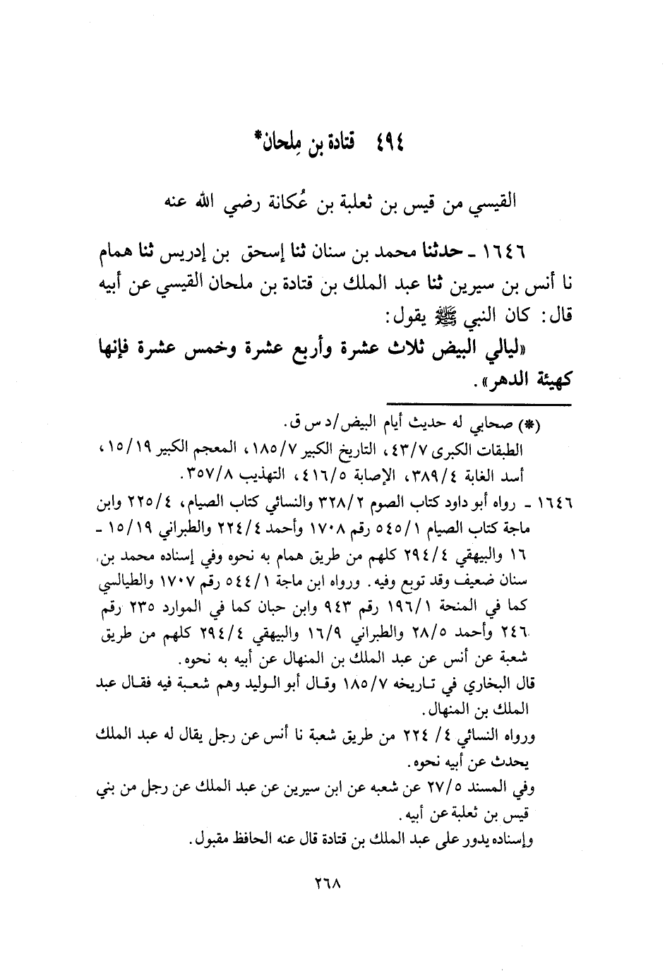 1646 - حَدَّثَنَا مُحَمَّدُ بْنُ سِنَانٍ، ثنا إِسْحَاقُ بْنُ إِدْرِيسَ، ثنا هَمَّامٌ، نا أَنَسُ بْنُ سِيرِينَ، ثنا عَبْدُ الْمَلِكِ بْنُ قَتَادَةَ بْنِ مِلْحَانَ الْقَيْسِيُّ، عَنْ أَبِيهِ قَالَ: كَانَ النَّبِيُّ صَلَّى اللهُ عَلَيْهِ وَسَلَّمَ يَقُولُ: «§لَيَالِي الْبِيضِ ثَلَاثَ عَشْرَةَ وَأَرْبَعَ عَشْرَةَ وَخَمْسَ عَشْرَةَ؛ فَإِنَّهَا كَهَيْئَةِ الدَّهْرِ»