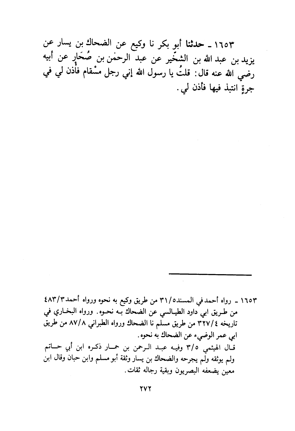 1653 - حَدَّثَنَا أَبُو بَكْرٍ، نا وَكِيعٌ، عَنِ الضَّحَّاكِ بْنِ يَسَارٍ، عَنْ يَزِيدَ بْنِ عَبْدِ اللَّهِ بْنِ الشِّخِّيرِ، عَنْ عَبْدِ الرَّحْمَنِ بْنِ صُحَارٍ، عَنْ أَبِيهِ رَضِيَ اللَّهُ عَنْهُ قَالَ: قُلْتُ: يَا رَسُولَ اللَّهِ، «§إِنِّي رَجُلٌ مِسْقَامٌ فَأْذَنْ لِي فِي جَرَّةٍ أَنْتَبِذُ فِيهَا فَأَذِنَ لِي»