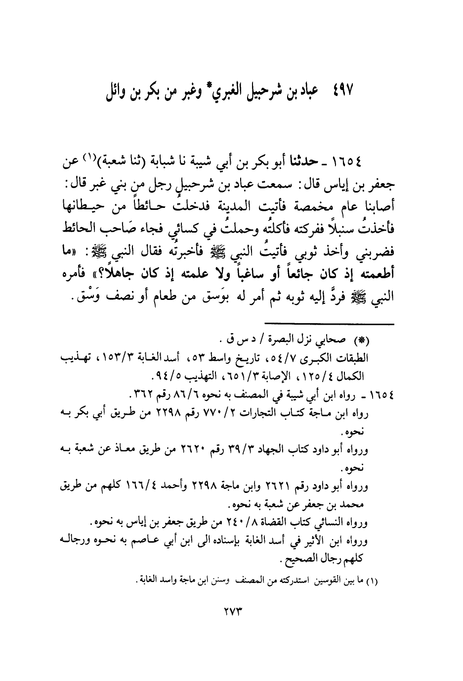 1654 - حَدَّثَنَا أَبُو بَكْرِ بْنُ أَبِي شَيْبَةَ، نا شَبَابَةُ، ثنا شُعْبَةُ، عَنْ جَعْفَرِ بْنِ إِيَاسٍ قَالَ: سَمِعْتُ عَبَّادَ بْنَ شُرَحْبِيلَ رَجُلٌ مِنْ بَنِي غُبَرَ قَالَ: " §أَصَابَنَا عَامًا مَخْمَصَةٌ فَأَتَيْتُ الْمَدِينَةَ فَدَخَلْتُ حَائِطًا مِنْ حِيطَانِهَا فَأَخَذْتُ سُنْبُلًا فَفَرَكْتُهُ فَأَكَلْتُهُ وَحَمَلْتُ فِي كِسَائِي، فَجَاءَ صَاحِبُ الْحَائِطِ فَضَرَبَنِي وَأَخَذَ ثَوْبِي، فَأَتَيْتُ النَّبِيَّ صَلَّى اللهُ عَلَيْهِ وَسَلَّمَ فَأَخْبَرْتُهُ، فَقَالَ النَّبِيُّ صَلَّى اللهُ عَلَيْهِ وَسَلَّمَ: «مَا أَطْعَمْتَهُ إِذْ كَانَ جَائِعًا أَوْ سَاغِبًا وَلَا عَلَّمْتَهُ إِذْ كَانَ جَاهِلًا» فَأَمَرَهُ النَّبِيُّ صَلَّى اللهُ عَلَيْهِ وَسَلَّمَ فَرَدَّ إِلَيْهِ ثَوْبَهُ ثُمَّ أَمَرَ لَهُ بِوَسْقٍ مِنْ طَعَامٍ أَوْ نِصْفِ وَسْقٍ "