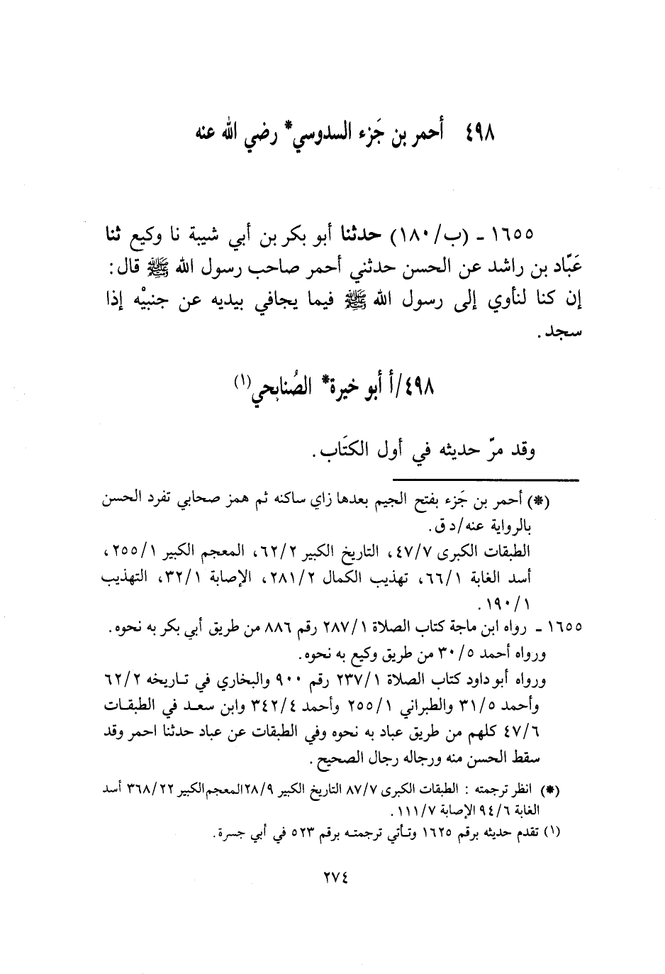 1655 - حَدَّثَنَا أَبُو بَكْرِ بْنُ أَبِي شَيْبَةَ، نا وَكِيعٌ، ثنا عَبَّادُ بْنُ رَاشِدٍ، عَنِ الْحَسَنِ، حَدَّثَنِي أَحْمَرُ صَاحِبُ رَسُولِ اللَّهِ صَلَّى اللهُ عَلَيْهِ وَسَلَّمَ قَالَ: «§إِنْ كُنَّا لَنَأْوِي إِلَى رَسُولِ اللَّهِ صَلَّى اللهُ عَلَيْهِ وَسَلَّمَ فِيمَا يُجَافِي بِيَدَيْهِ عَنْ جَنْبَيْهِ إِذَا سَجَدَ»