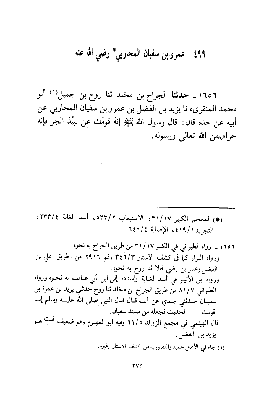 1656 - حَدَّثَنَا الْجَرَّاحُ بْنُ مَخْلَدٍ، ثنا رَوْحُ بْنُ جَمِيلٍ أَبُو مُحَمَّدٍ الْمِنْقَرِيُّ، نا يَزِيدُ بْنُ الْفَضْلِ بْنِ عَمْرِو بْنِ سُفْيَانَ الْمُحَارِبِيُّ، عَنْ أَبِيهِ، عَنْ جَدِّهِ قَالَ: قَالَ رَسُولُ اللَّهِ صَلَّى اللهُ عَلَيْهِ وَسَلَّمَ: «§انْهَ قَوْمَكَ عَنْ نَبِيذِ الْجَرِّ؛ فَإِنَّهُ حَرَامٌ مِنَ اللَّهِ تعالى وَرَسُولِهِ»