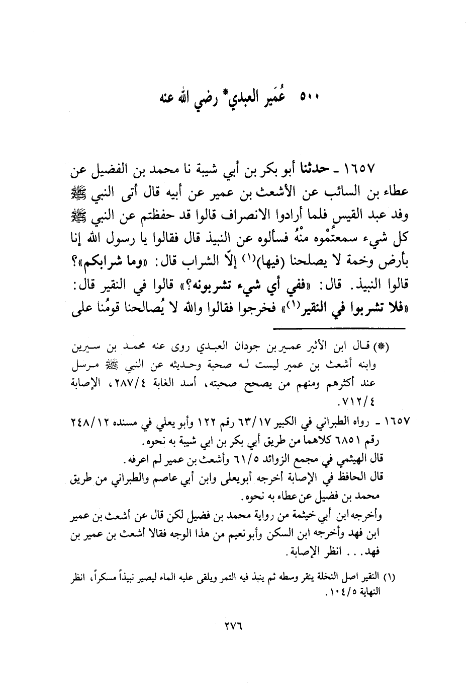1657 - حَدَّثَنَا أَبُو بَكْرِ بْنُ أَبِي شَيْبَةَ، نا مُحَمَّدُ بْنُ الْفُضَيْلِ، عَنْ عَطَاءِ بْنِ السَّائِبِ، عَنْ الْأَشْعَثِ بْنِ عُمَيْرٍ، عَنْ أَبِيهِ قَالَ: أَتَى النَّبِيَّ صَلَّى اللهُ عَلَيْهِ وَسَلَّمَ وَفْدُ عَبْدِ الْقَيْسِ فَلَمَّا أَرَادُوا الِانْصِرَافَ قَالُوا: قَدْ حَفِظْتُمْ عَنِ النَّبِيِّ صَلَّى اللهُ عَلَيْهِ وَسَلَّمَ كُلَّ شَيْءٍ سَمِعْتُمُوهُ مِنْهُ فَسَأَلُوهُ عَنِ النَّبِيذِ قَالَ: فَقَالُوا يَا رَسُولَ اللَّهِ، إِنَّا بِأَرْضٍ وَخِمَةٍ لَا يُصْلِحُنَا فِيهَا إِلَّا الشَّرَابُ. قَالَ: «وَمَا شَرَابُكُمْ؟» قَالُوا: النَّبِيذُ. قَالَ: «فَفِي أَيِّ شَيْءٍ تَشْرَبُونَهُ؟» قَالُوا: فِي النَّقِيرِ. قَالَ: «فَلَا تَشْرَبُوا فِي النَّقِيرِ» . فَخَرَجُوا فَقَالُوا: وَاللَّهِ لَا يُصَالِحُنَا قَوْمُنَا عَلَى -[277]- هَذَا. فَرَجَعُوا فَسَأَلُوهُ فَقَالَ لَهُمْ مِثْلَ ذَلِكَ ثُمَّ أَعَادُوا فَقَالَ لَهُمْ: «§لَا تَشْرَبُوا فِي النَّقِيرِ فَيَضْرِبُ الرَّجُلُ مِنْكُمُ ابْنَ عَمِّهِ ضَرْبَةً لَا يَزَالُ أَعْرَجَ مِنْهَا إِلَى يَوْمِ الْقِيَامَةِ» قَالَ: فَضَحِكُوا. فَقَالَ: «مِنْ أَيِّ شَيْءٍ تَضْحَكُونَ؟» قَالُوا: يَا رَسُولَ اللَّهِ، وَالَّذِي بَعَثَكَ بِالْحَقِّ لَقَدْ شَرِبْنَا فِي نَقِيرٍ لَنَا فَقَامَ بَعْضُنَا إِلَى بَعْضٍ فَضُرِبَ هَذَا ضَرْبَةً عَرَجَ مِنْهَا إِلَى يَوْمِ الْقِيَامَةِ