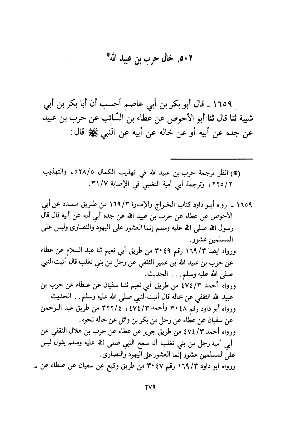1659 - قَالَ أَبُو بَكْرٍ بْنِ أَبِي عَاصِمٍ أحسب أَنَّ أَبَا بَكْرِ بْنَ أَبِي شَيْبَةَ، ثنا قَالَ: ثنا أَبُو الْأَحْوَصِ، عَنْ عَطَاءِ بْنِ السَّائِبِ، عَنْ حَرْبِ بْنِ عُبَيْدٍ، عَنْ جَدِّهِ، عَنْ أَبِيهِ، أَوْ عَنْ خَالِهِ، عَنْ أَبِيهِ، عَنِ النَّبِيِّ صَلَّى اللهُ عَلَيْهِ وَسَلَّمَ قَالَ -[280]-: «§لَيْسَ عَلَى الْمُؤْمِنِ عَاشُورٌ»