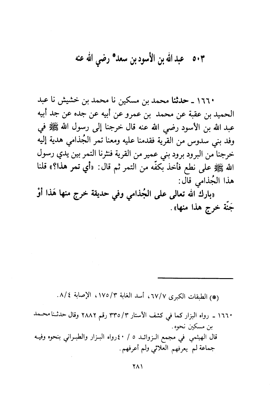 1660 - حَدَّثَنَا مُحَمَّدُ بْنُ مِسْكِينٍ، نا مُحَمَّدُ بْنُ خَشِيشٍ، نا عَبْدُ الْحَمِيدِ بْنُ عُقْبَةَ، عَنْ مُحَمَّدِ بْنِ عَمْرٍو، عَنْ أَبِيهِ، عَنْ جَدِّهِ، عَنْ جَدِّ أَبِيهِ عَبْدِ اللَّهِ بْنِ الْأَسْوَدِ رَضِيَ اللَّهُ عَنْهُ قَالَ: خَرَجْنَا إِلَى رَسُولِ اللَّهِ صَلَّى اللهُ عَلَيْهِ وَسَلَّمَ فِي وَفْدِ بَنِي سَدُوسٍ مِنَ الْقَرْيَةِ فَقَدِمْنَا عَلَيْهِ وَمَعَنَا تَمْرُ الْجُذَامِيِّ هَدِيَّةٌ إِلَيْهِ خَرَجْنَا مِنَ الْبُرُودِ بُرُودِ بَنِي عُمَيْرٍ مِنَ الْقَرْيَةِ فَنَثَرْنَا التَّمْرَ بَيْنَ يَدَيْ رَسُولِ اللَّهِ صَلَّى اللهُ عَلَيْهِ وَسَلَّمَ عَلَى نِطَعٍ فَأَخَذَ بِكَفِّهِ مِنَ التَّمْرِ. ثُمَّ قَالَ: «أَيُّ تَمْرٍ هَذَا؟» قُلْنَا: هَذَا الْجُذَامِيُّ قَالَ: «§بَارَكَ اللَّهُ تَعَالَى عَلَى الْجُذَامِيِّ وَفِي حَدِيقَةٍ خَرَجَ مِنْهَا هَذَا أَوْ جَنَّةٍ خَرَجَ هَذَا مِنْهَا»